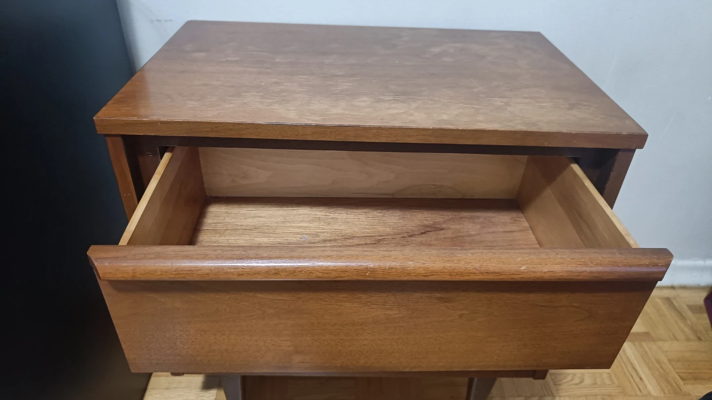 Here's a lovely wooden nightstand with two drawers! It's in great condition and would look great in any bedroom. It's perfect for storing bedside essentials