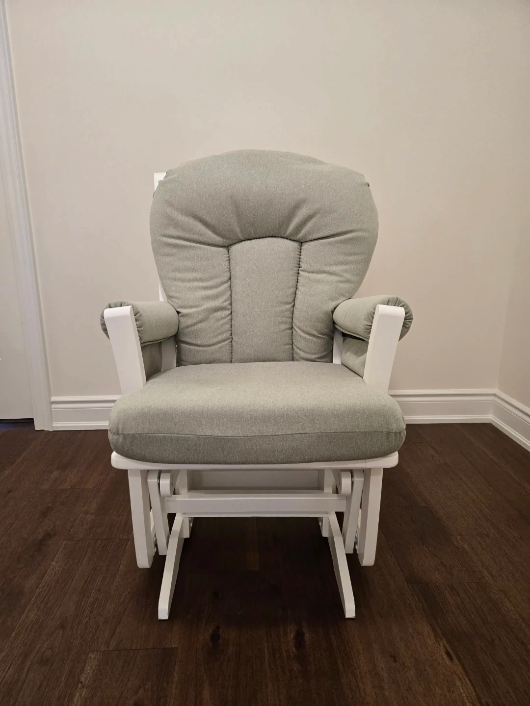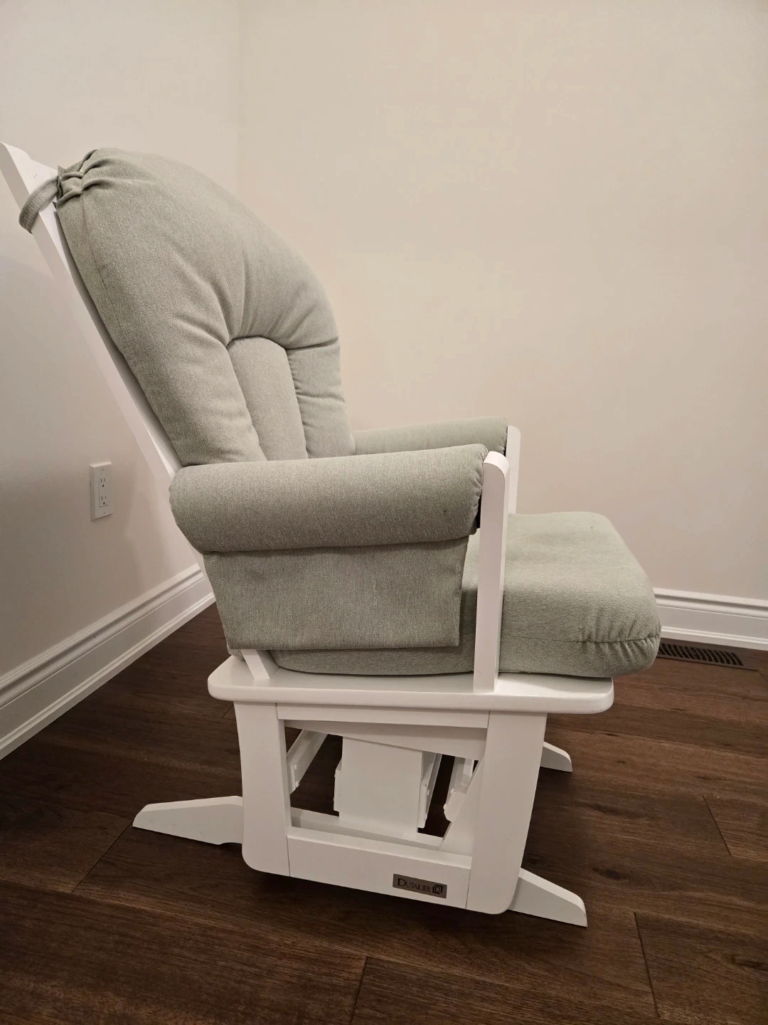 Selling a Dutailier gliding rocking chair, perfect for nursing. Features thick, comfy cushions and smooth gliding. Solid wood, high quality, sturdy construction. Gently used. Good condition.
