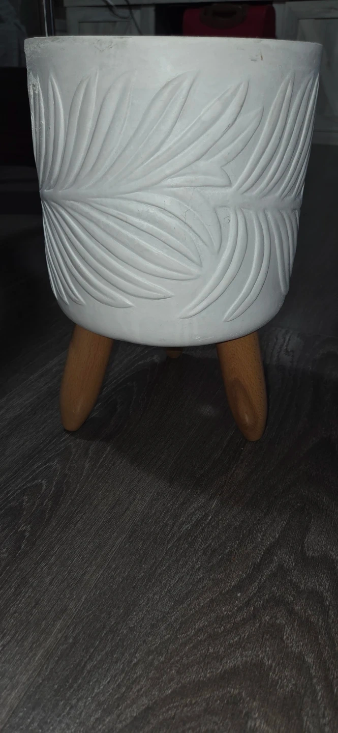 Selling a cute white plant pot with wooden legs! It has a nice leaf pattern on the side. It's in good condition and would look great in any room