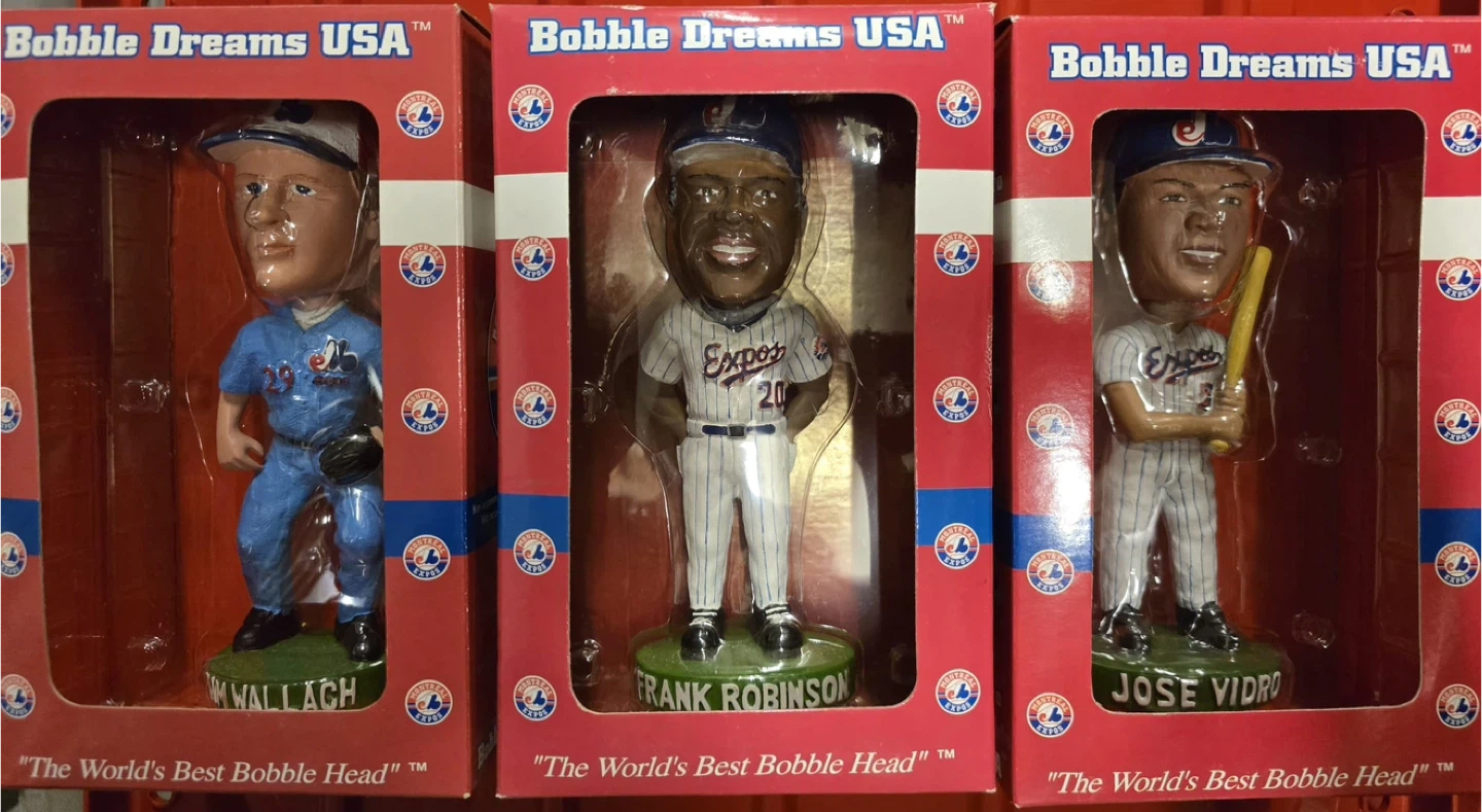 Selling a set of Bobble Dreams USA Expos bobbleheads. The set includes Tim Wallach, Frank Robinson, and Jose Vidro. Each comes in its original box, perfect for any Expos fan or bobblehead collector