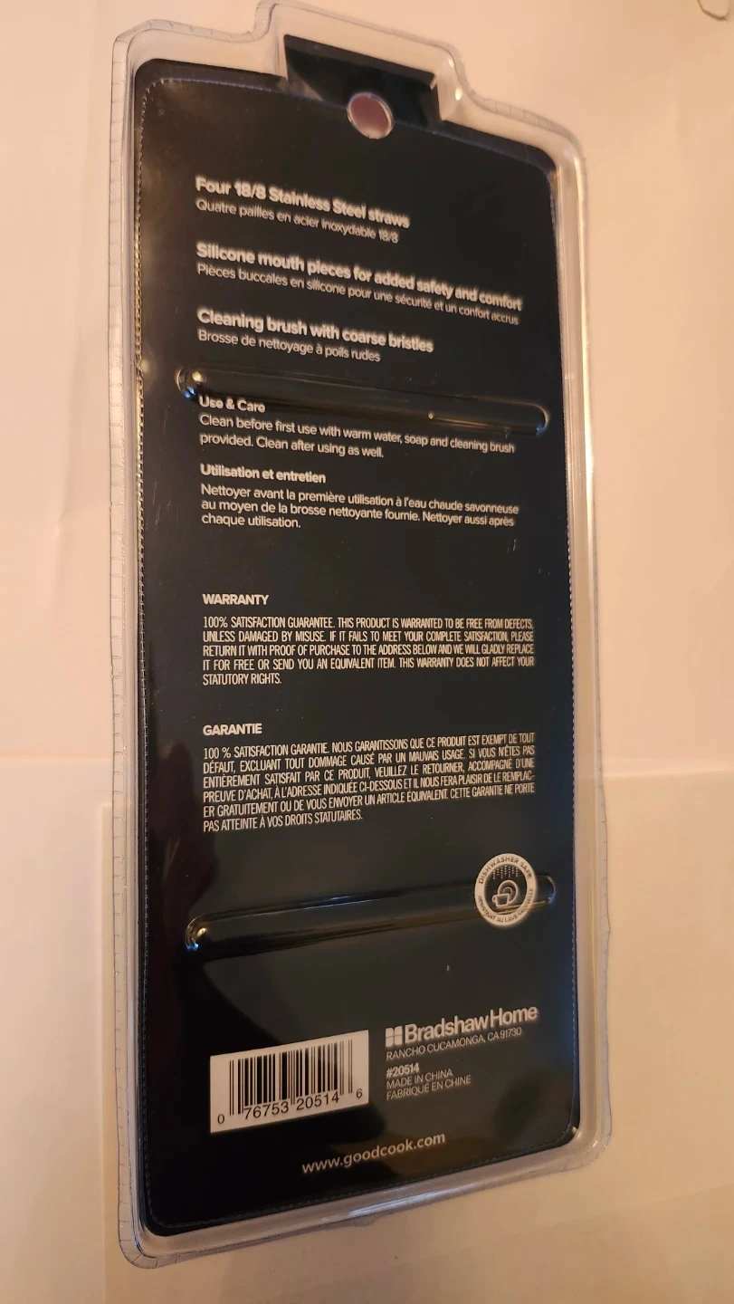 Brand new set of GoodCook stainless steel straws! This set includes four 18/8 stainless steel straws with silicone mouth pieces for added safety and comfort. Also comes with a cleaning brush with coarse bristles to keep your straws sparkling clean. Enjoy your favourite beverages in style!