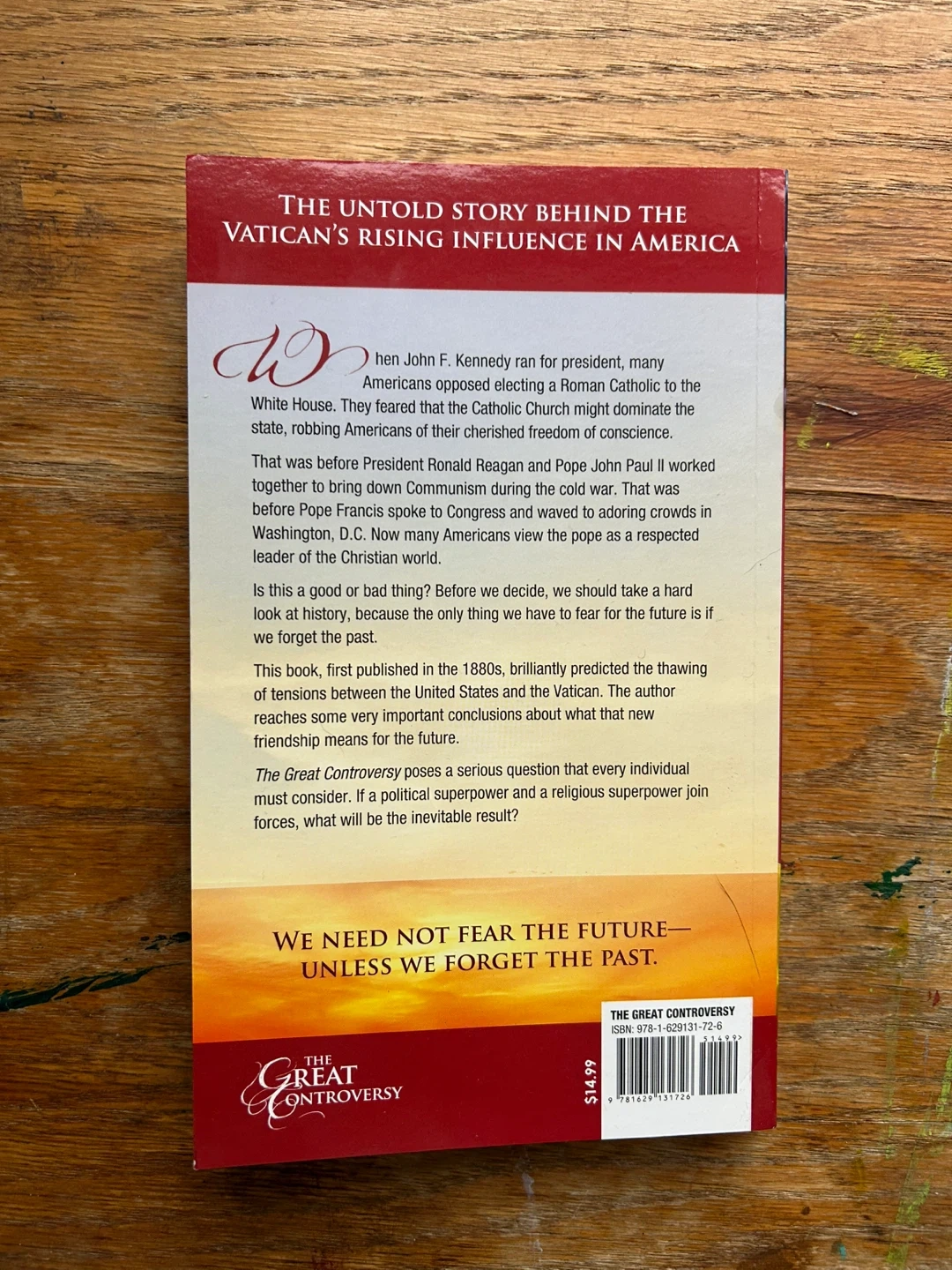 Selling a copy of "The Great Controversy" book. It explores the untold story behind the Vatican's rising influence in America and poses a serious question about what every individual must consider regarding political and religious superpowers