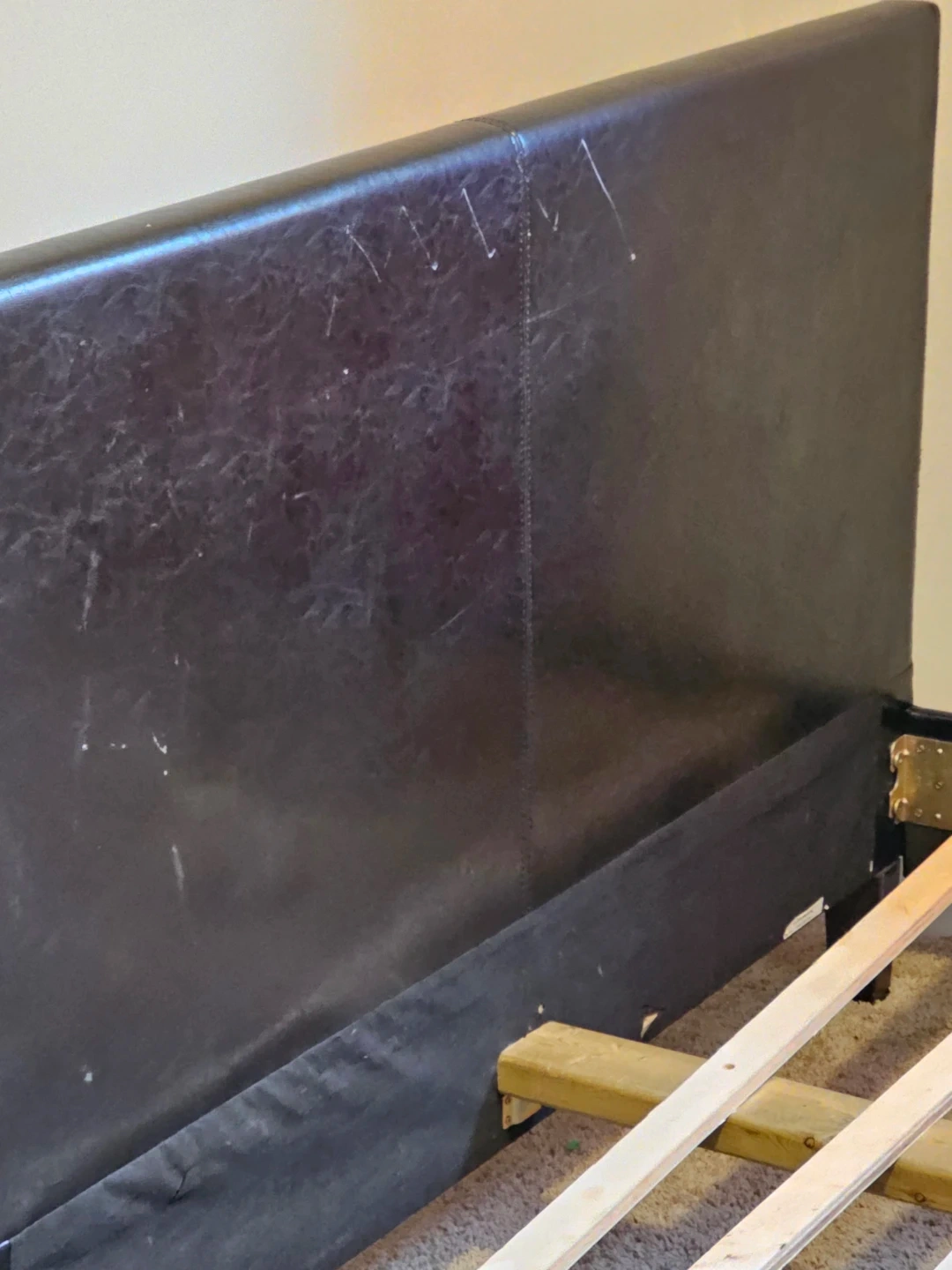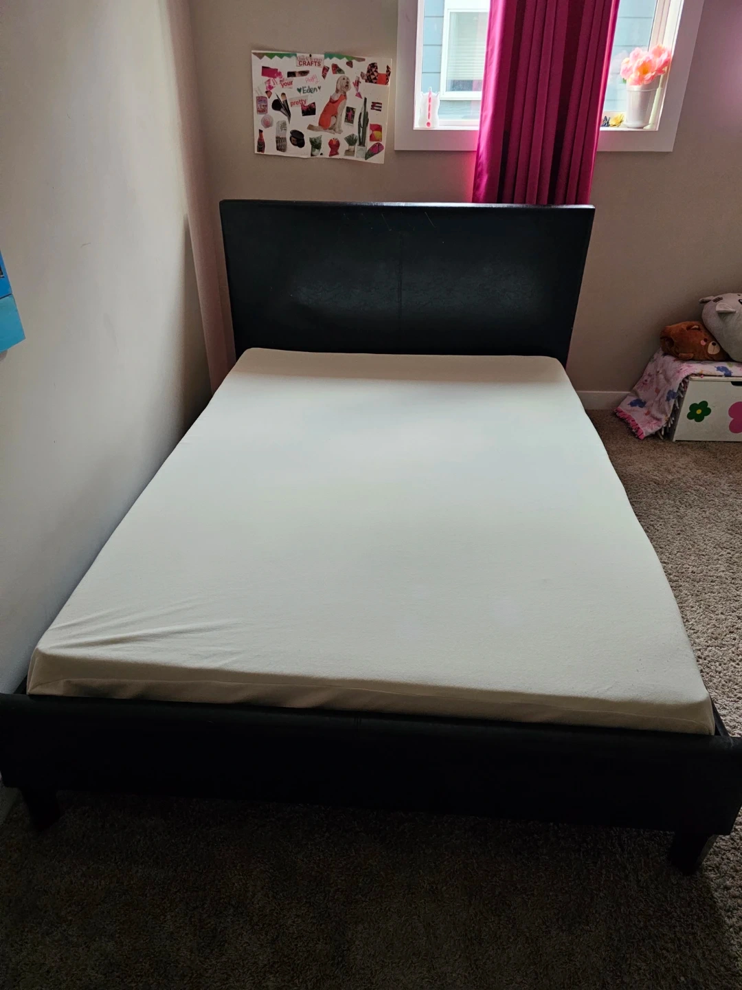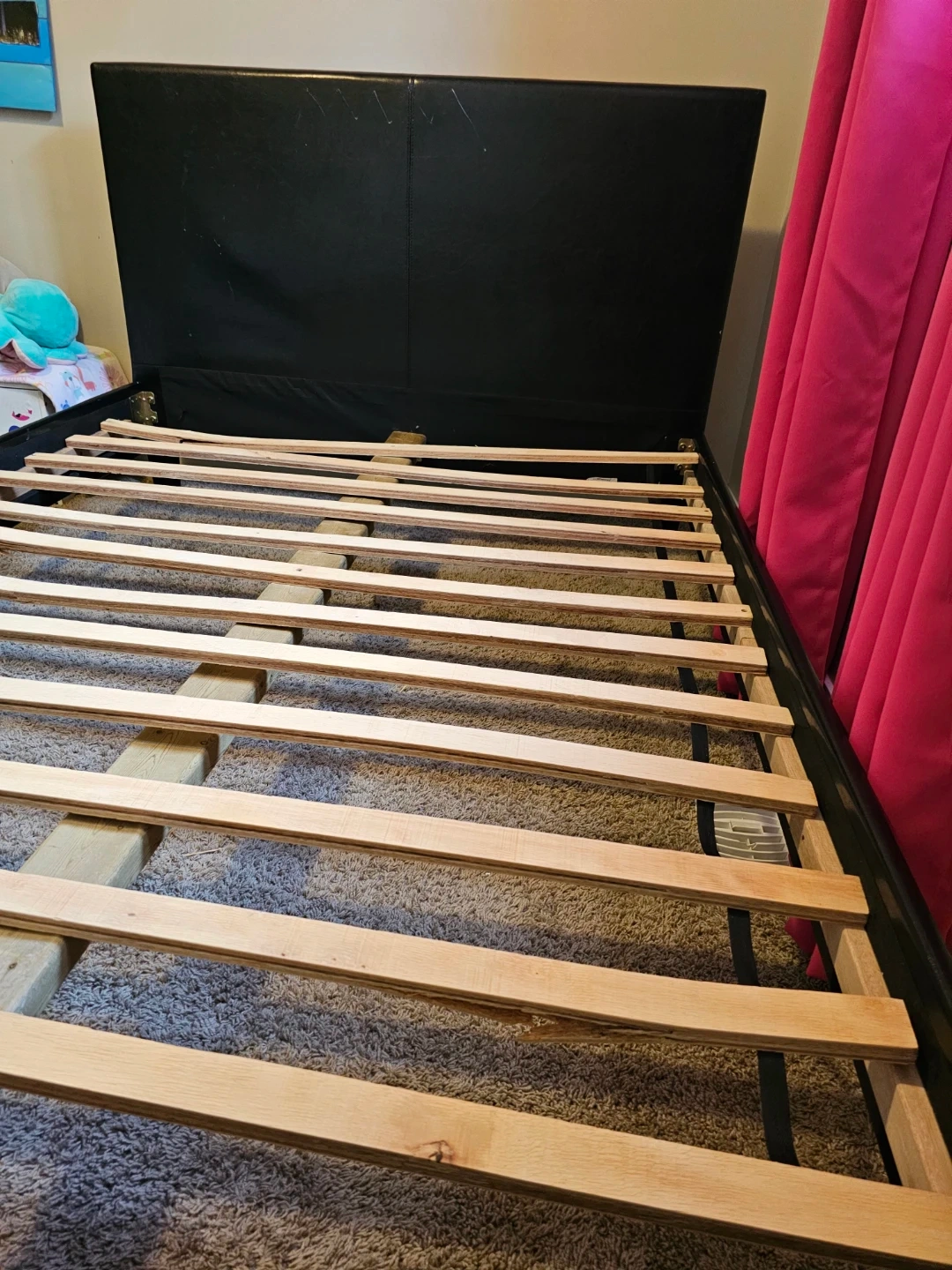 Selling a full size bed frame with a black faux leather headboard. The bed frame includes wooden slats for support. Please note that one of the slats has a crack, as shown in the pictures. Overall, it's a sturdy and stylish bed frame! Mattress included