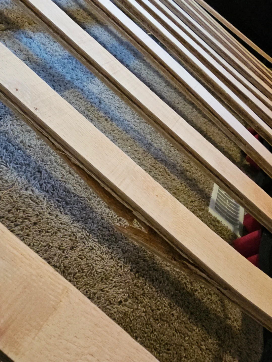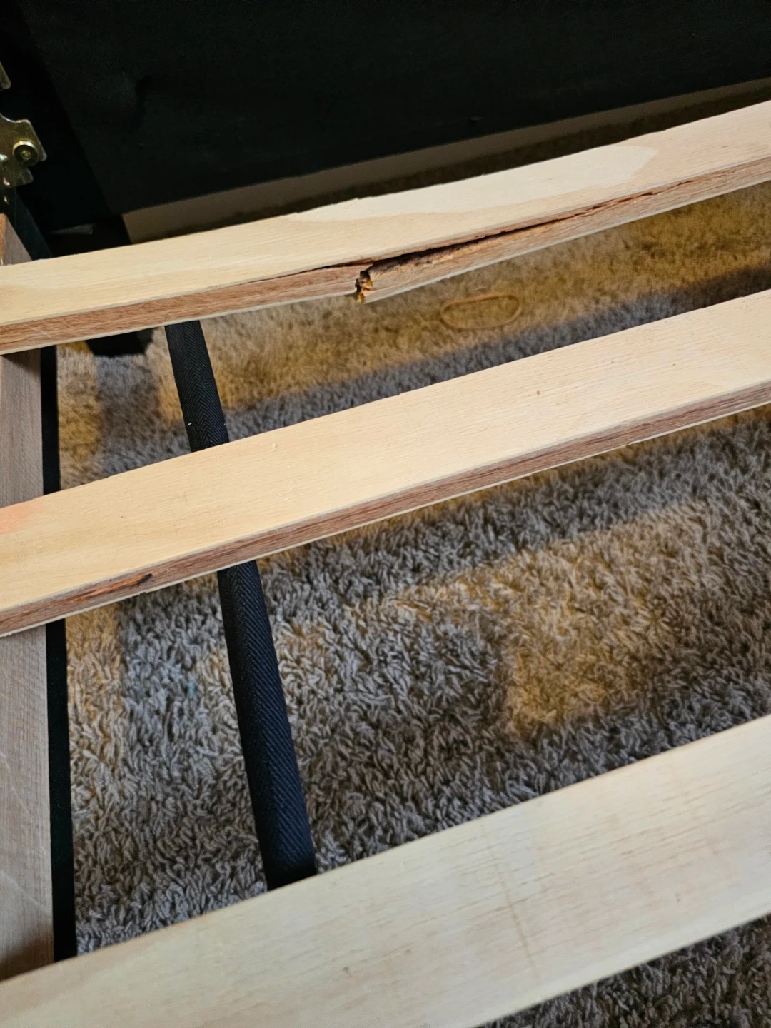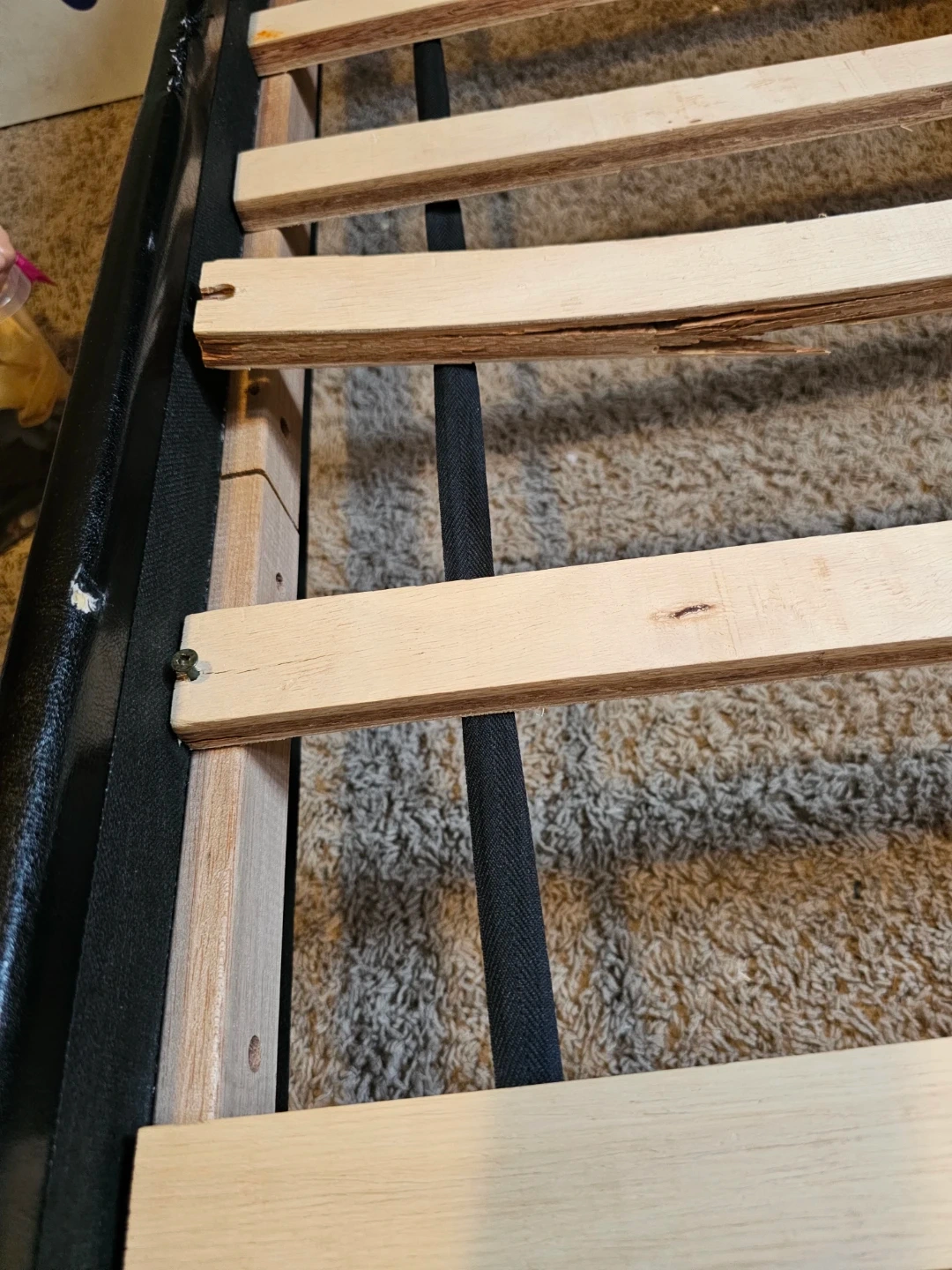 Selling a full size bed frame with a black faux leather headboard. The bed frame includes wooden slats for support. Please note that one of the slats has a crack, as shown in the pictures. Overall, it's a sturdy and stylish bed frame! Mattress included