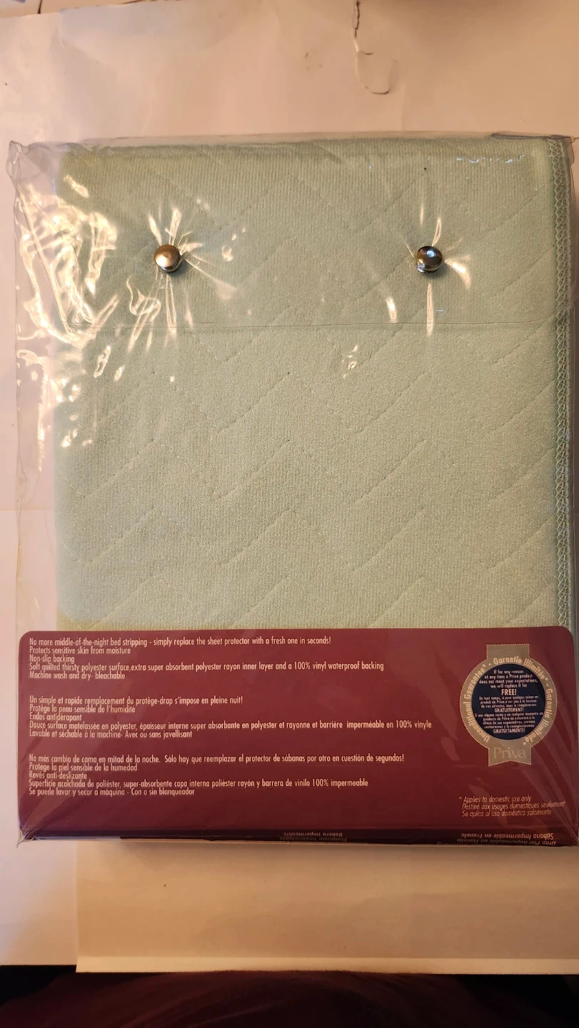 Selling a new Priva Premium De Luxe sheet protector! It's waterproof and measures 34" x 36". This sheet protector features a super absorbent polyester rayon inner layer and a 100% vinyl waterproof backing. It's also machine washable and dryable