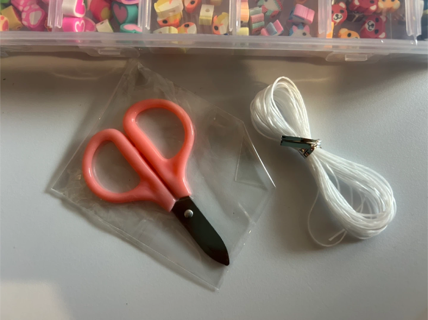 Selling a fun DIY bead set! It comes with a variety of colourful beads in different shapes and sizes, perfect for making bracelets, necklaces, and other crafts. Also included are scissors and string to get you started right away!