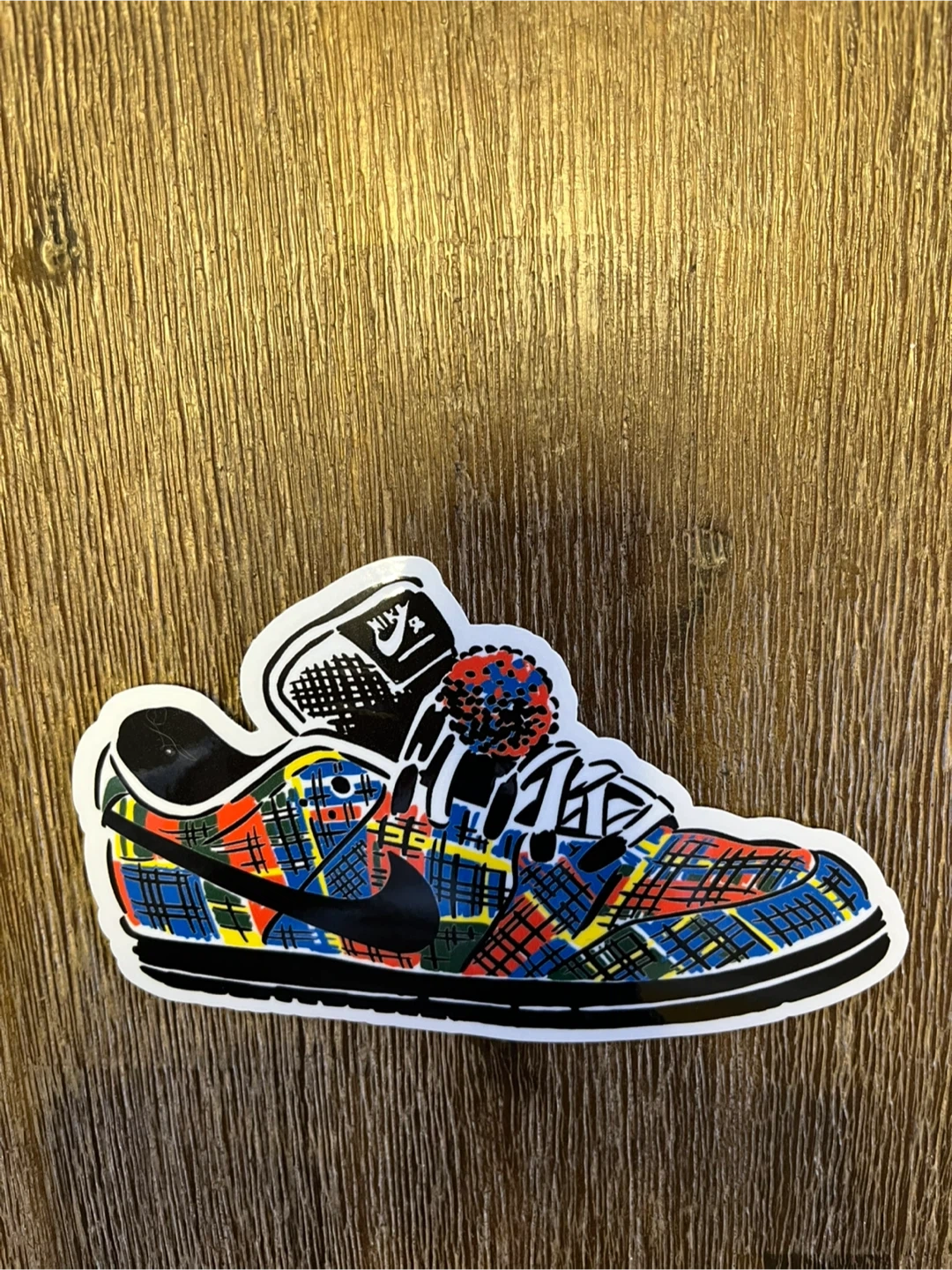 This sticker is an artistic rendition of the upcoming Nardwuar x Nike SB Dunk Low collaboration sneaker, which features a prominent multi-color tartan plaid pattern.