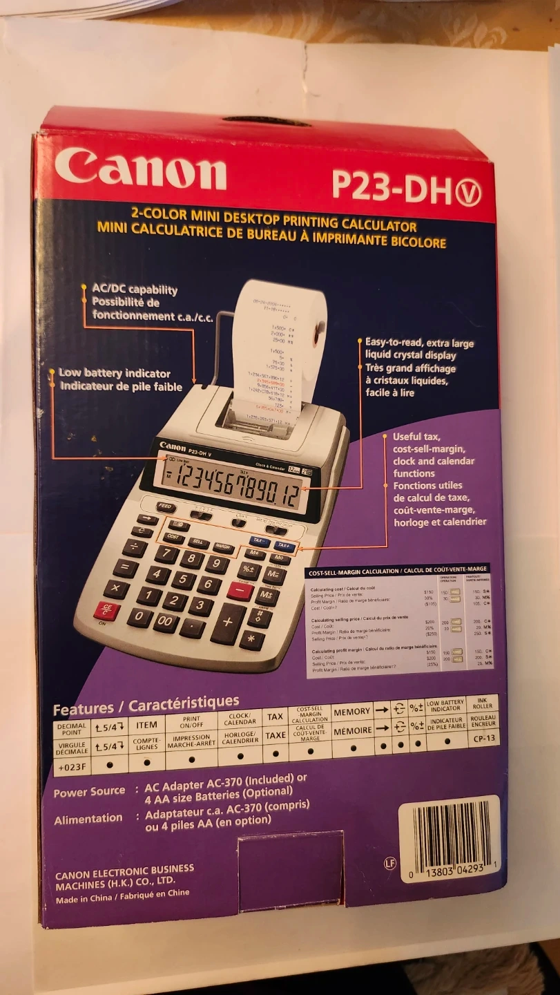 Selling a Brand New Canon P23-DH V 2-Color Mini Desktop Printing Calculator. It has a 12-digit display and prints in two colours. It also has clock and calendar functions, and includes an AC adapter. Comes with the box!