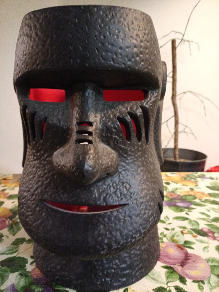 Here's a cool tiki head table lamp! It's in great shape and adds a unique touch to any room. The light shines through the eyes and mouth, creating a fun ambiance. Perfect for a tiki-themed space or just a fun accent piece