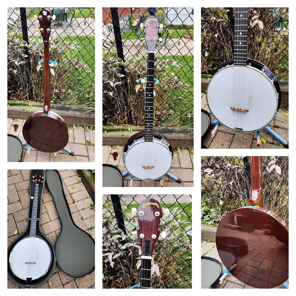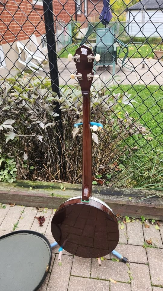 Right Handed 5-String Banjo, 18 Bracket Skirt, mahogany resonator, aluminum rim. This 5-string banjo is commonly used for country, folk, and bluegrass music.
