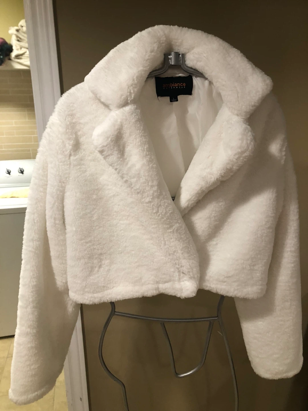 Here's a cozy white faux fur jacket from Ambiance Outerwear! It's a size large and would be perfect for adding a touch of warmth and style to your wardrobe