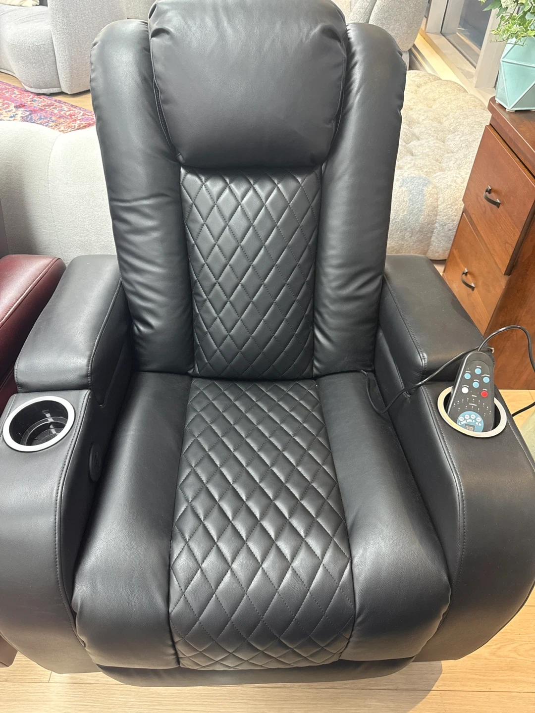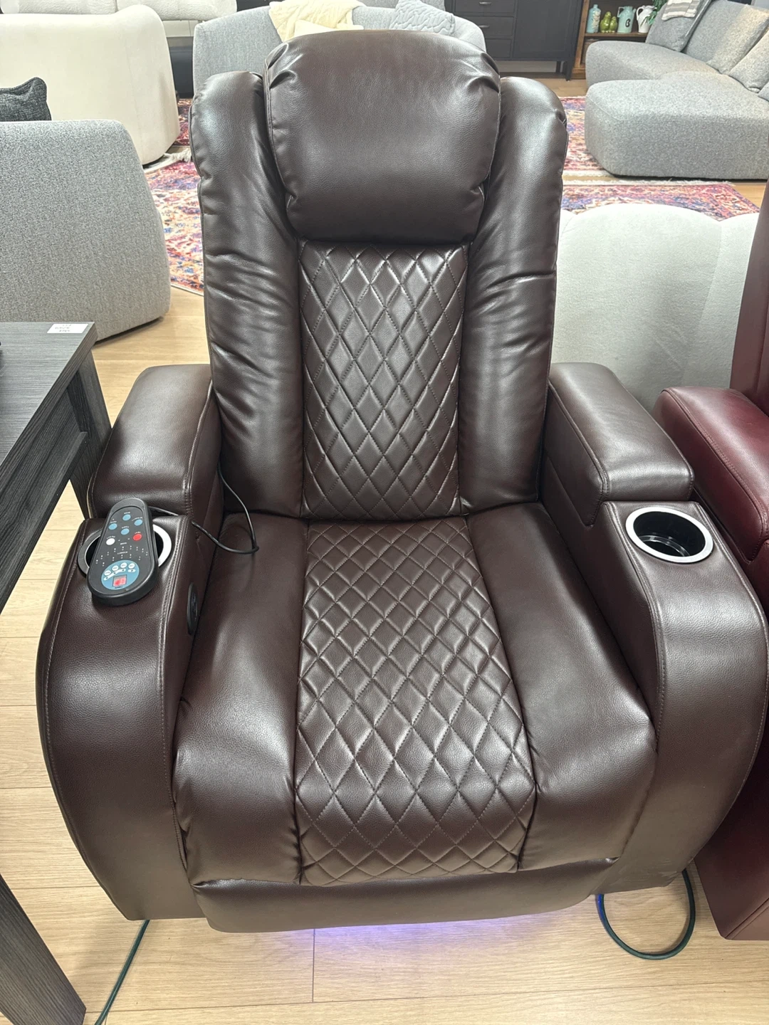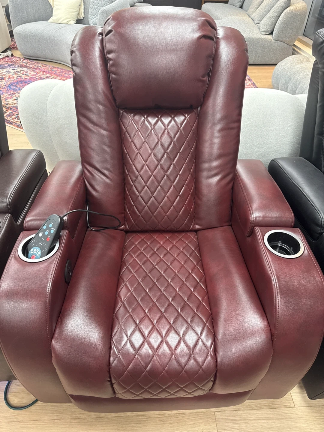 Here's a comfy leather massage recliner chair! It comes in a stylish design and would be perfect for relaxing after a long day. It features a remote control and cup holders for maximum convenience