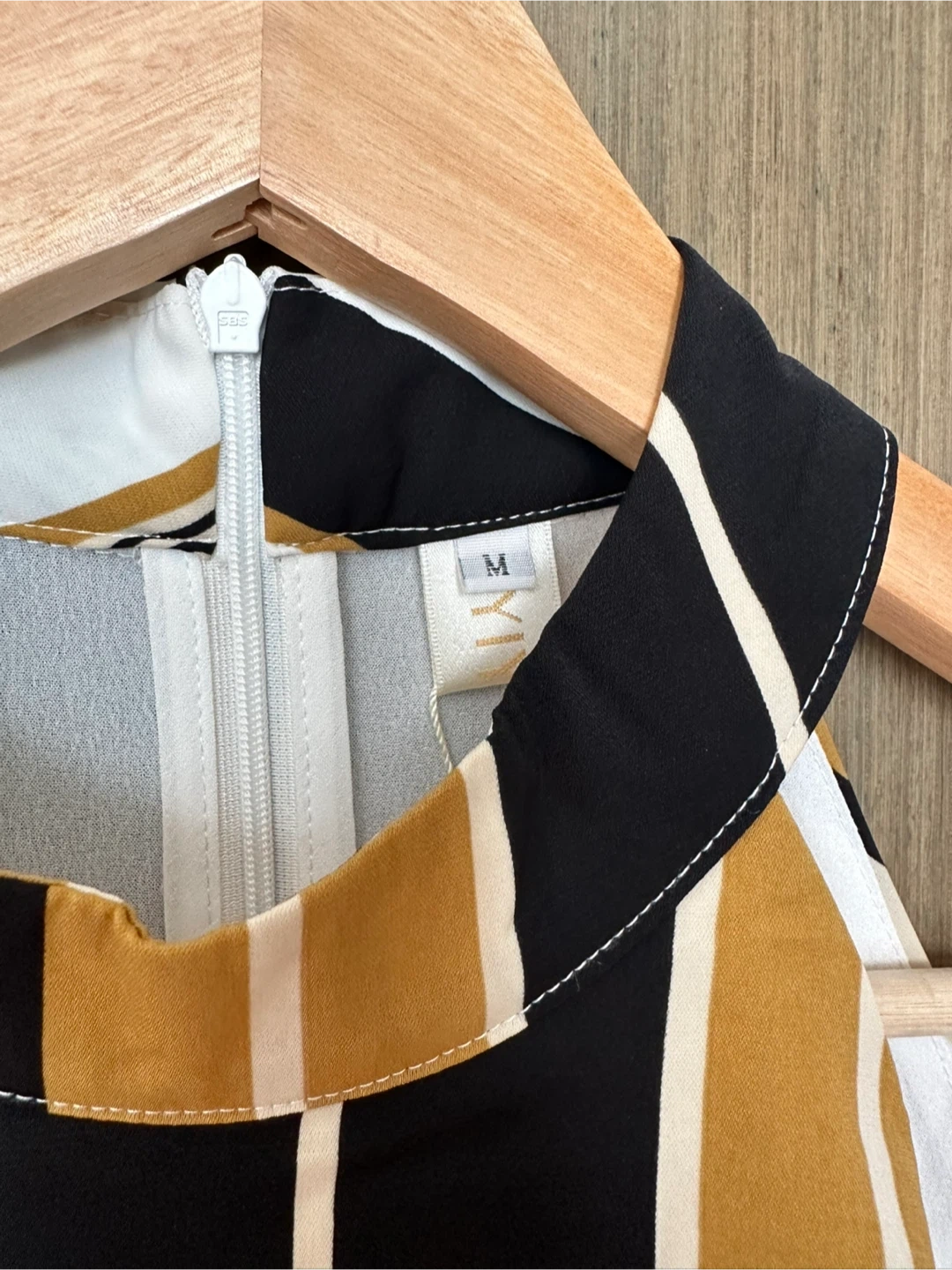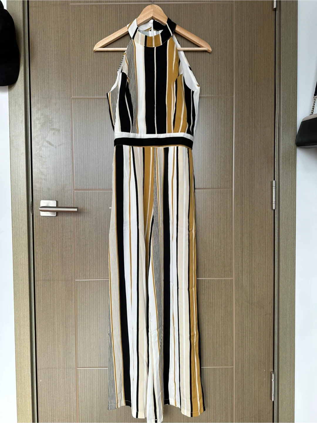 Selling a Marella striped jumpsuit in size XS. It features a halter neck and a stylish striped pattern in black, white, and gold tones. Perfect for a chic and comfortable look!