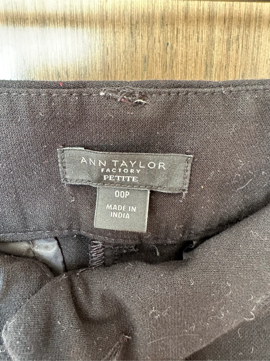 Buy & SellAnn Taylor Petite Black Pants Size 00PAnn Taylor Petite Black Pants Size 00P$18Selling a pair of Ann Taylor Factory Petite black pants in size 00P. They are in great condition and ready for a new owner!ConditionLike newSize00PBrandAnn TaylorWHERE TO MEETCheck LocationView MapSELLERverifiedLinhLong Island City650 reviews0 chats·0 favorites·4 views