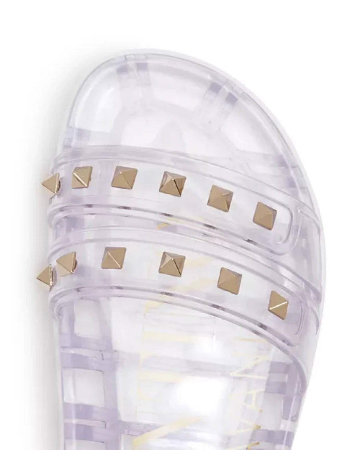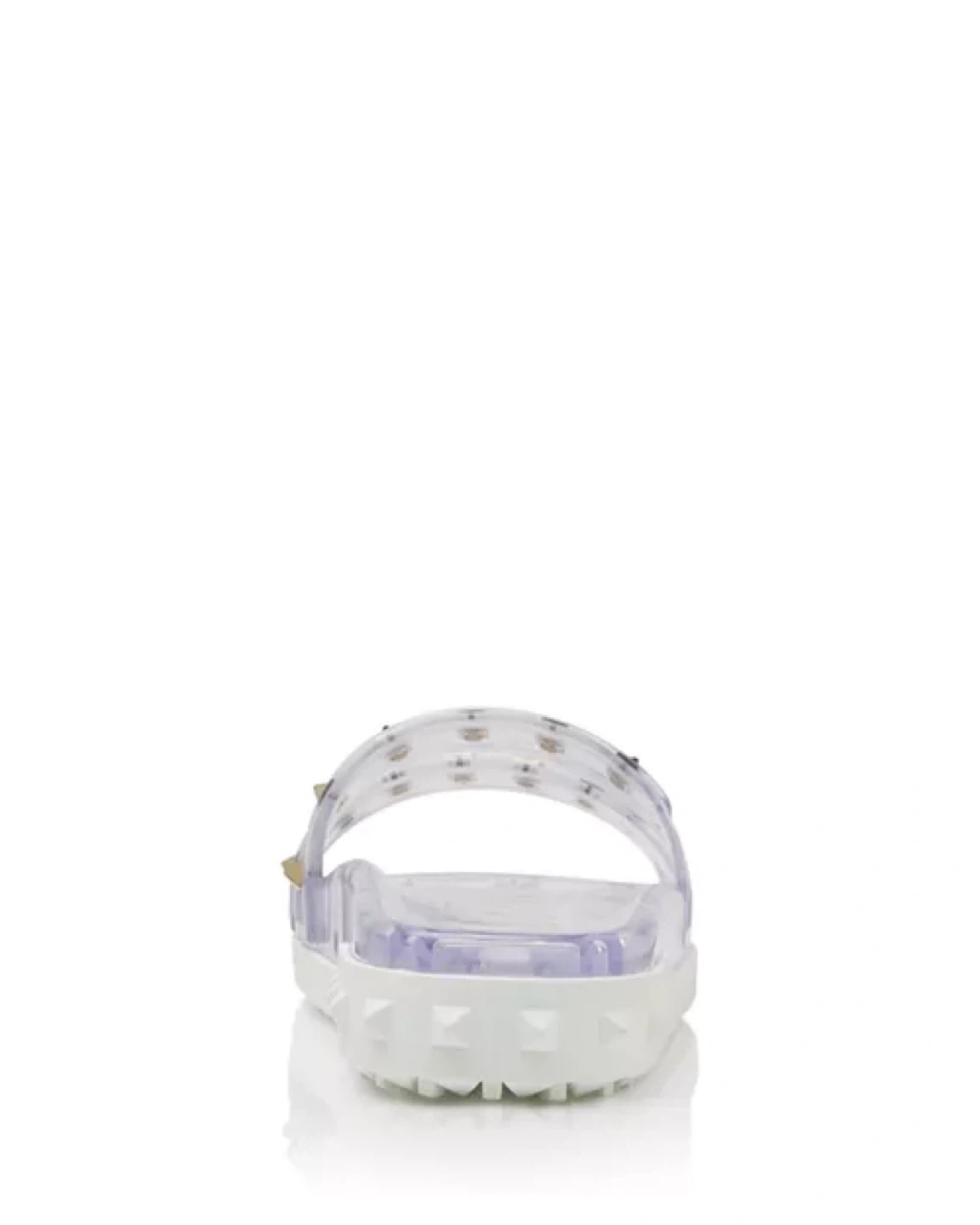 Valentino Garavani Rockstud rubber slide sandals in clear PVC with a white sole and platinum-finish studs.