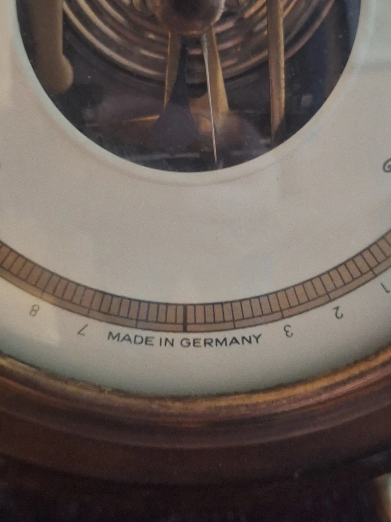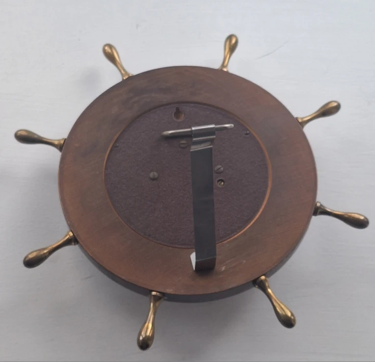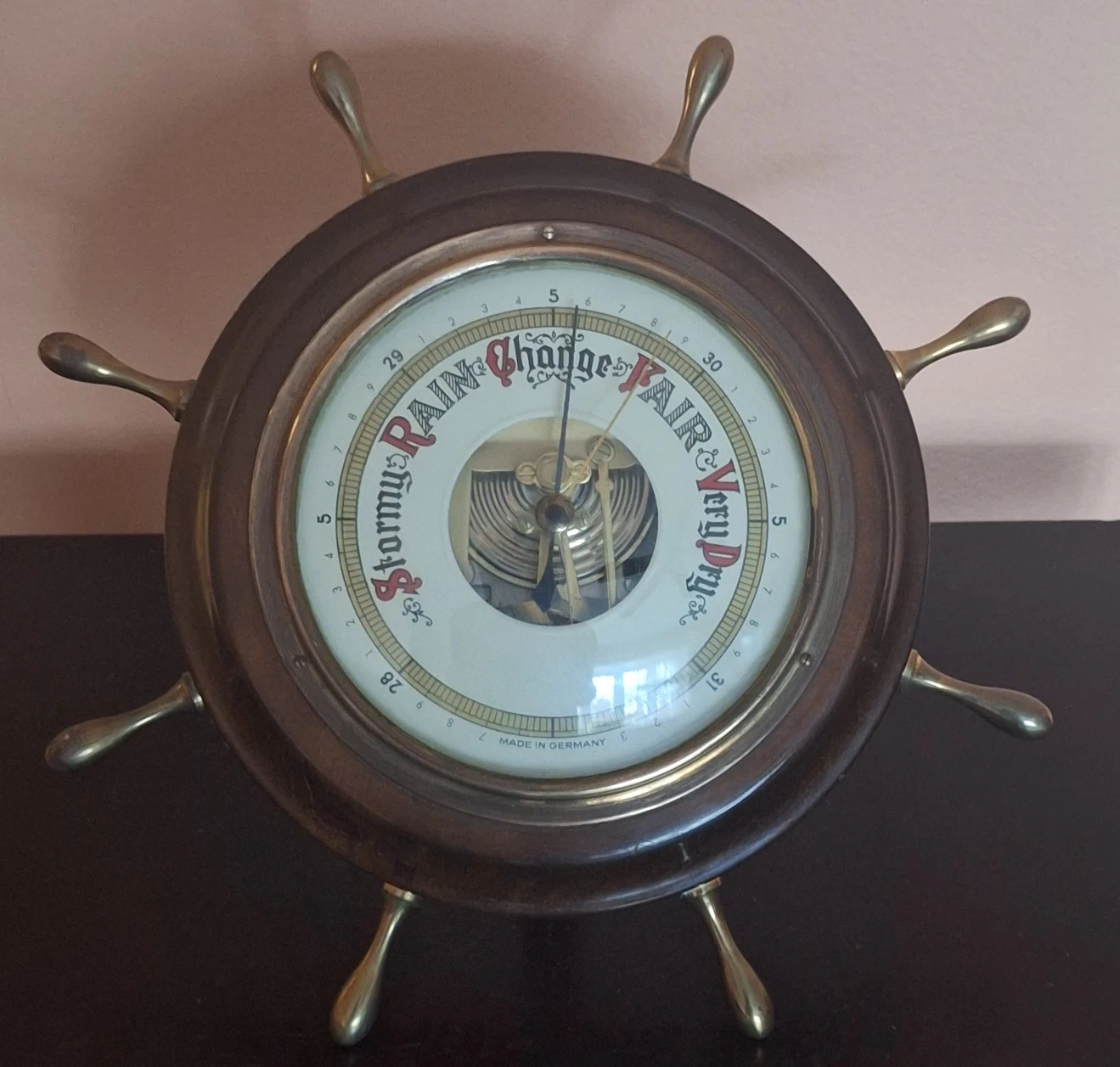 Here's a vintage barometer made in Germany. It features a classic design with a wooden frame and brass accents, resembling a ship's wheel. Can be hang on a wall or stand on the table. Diameter 9 inches