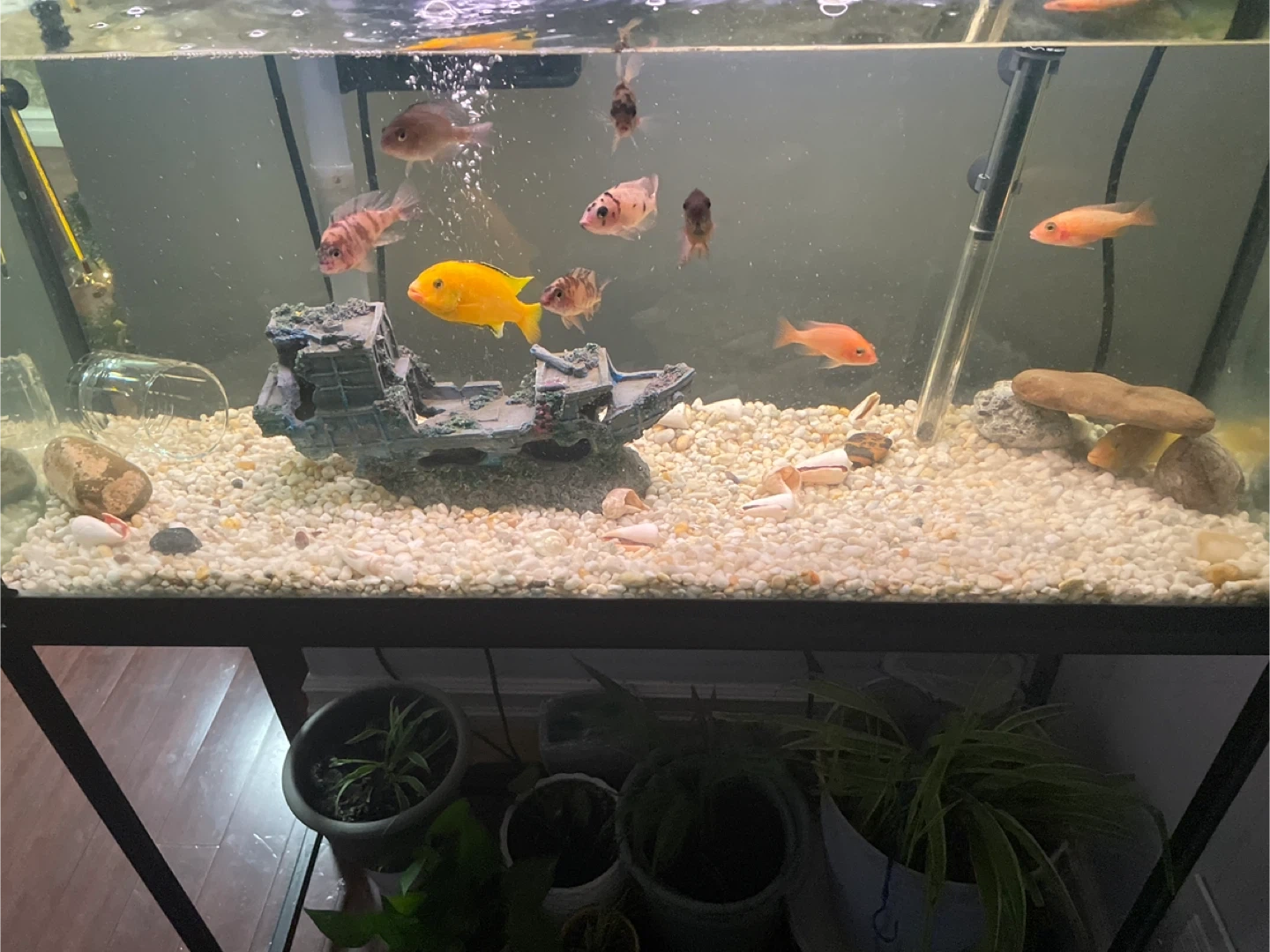 Hi I am selling beautiful chiclids small ones are $10 and the big yellow ones are $20. For the yellow one you have to buy together and price is negotiable. Only fish