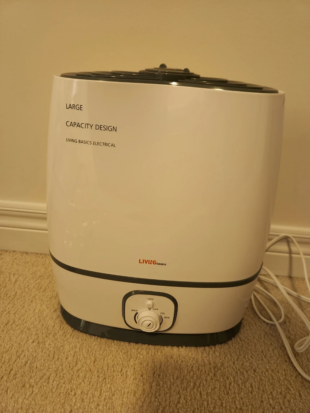 Selling a Living Basics Electrical humidifier with a large capacity design. It's like new and ready to use! It has a simple control knob to adjust the humidity level, from min to max, and an LED indicator.