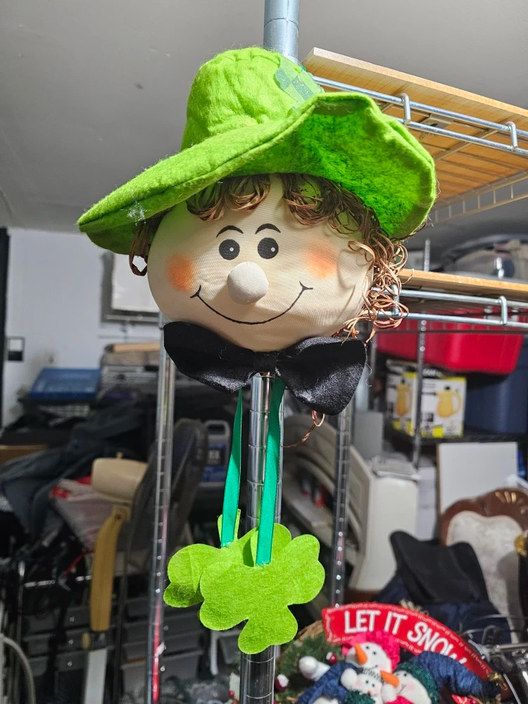 A charming leprechaun decoration! And a apron. It features a cheerful face, a green hat, and a shamrock accent, perfect for adding a festive touch to your home