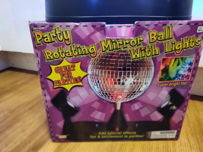Add some fun and excitement to your parties with this rotating mirror ball with lights! It's great for adding special effects and creating a super bright lite atmosphere. The box is included, along with the adapter.