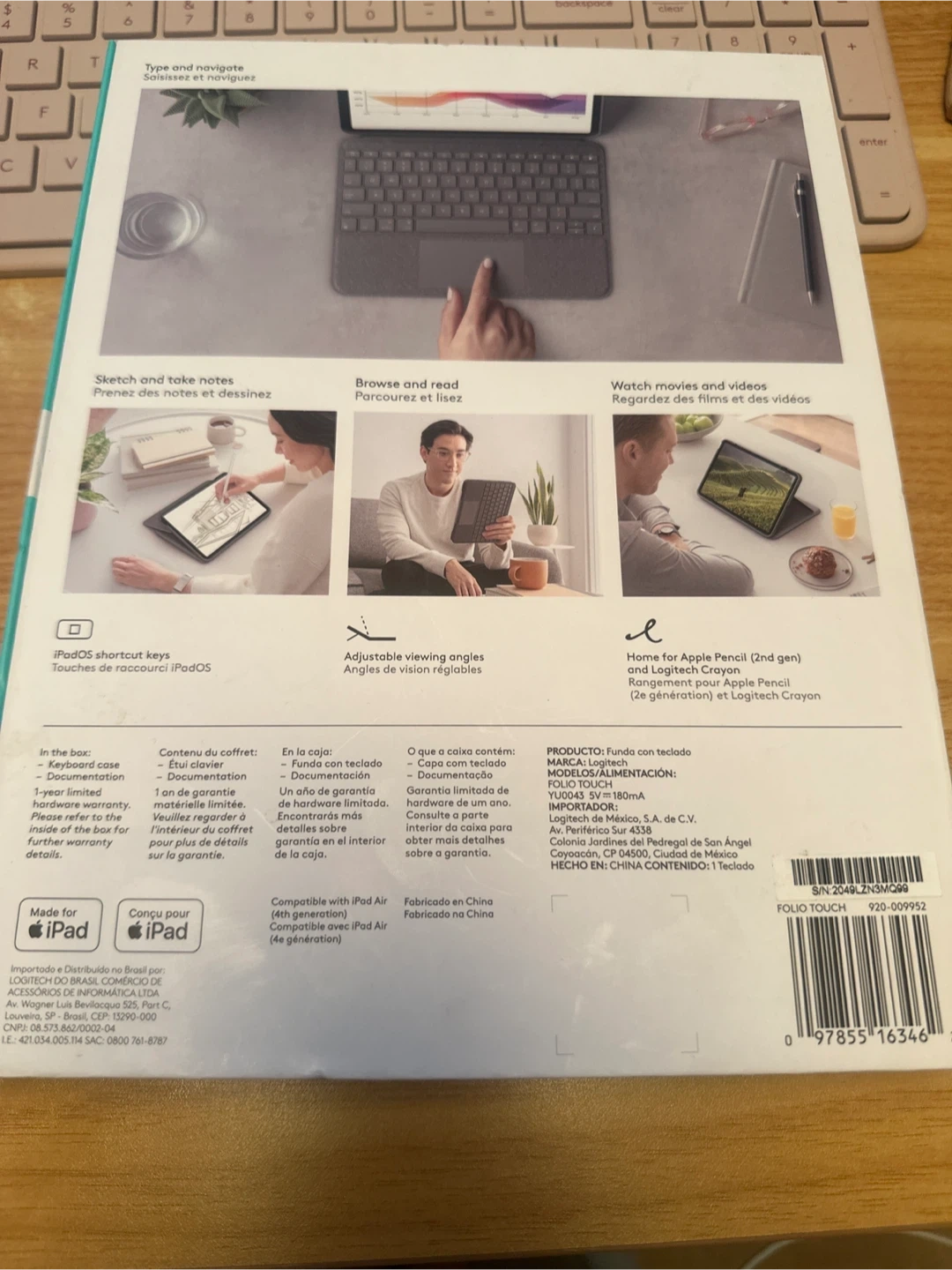 Selling a Logitech Folio Touch keyboard case for the 4th generation iPad Air. It's in brand new condition and comes with the original box and documentation. It features adjustable viewing angles, iPadOS shortcut keys, and a home for the Apple Pencil (2nd gen) and Logitech Crayon
