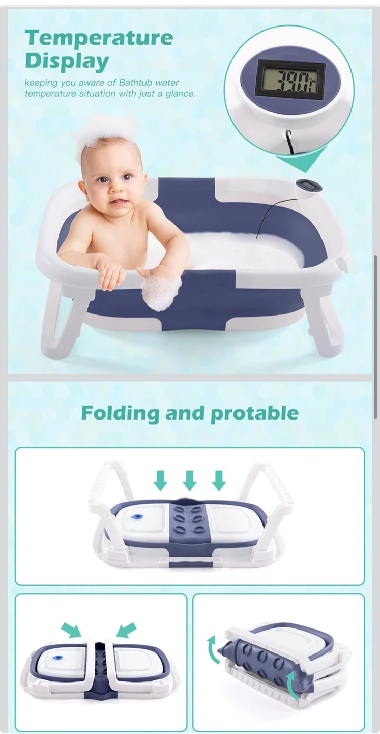 This is a folding and portable baby bathtub. It comes with a heat sensitive drain plug, shower head holder, and hanging holes. It also features a non-slip design. Included is a bath cushion and a waterproof ear cap. The temperature display helps you keep aware of the bathtub water temperature with just a glance.