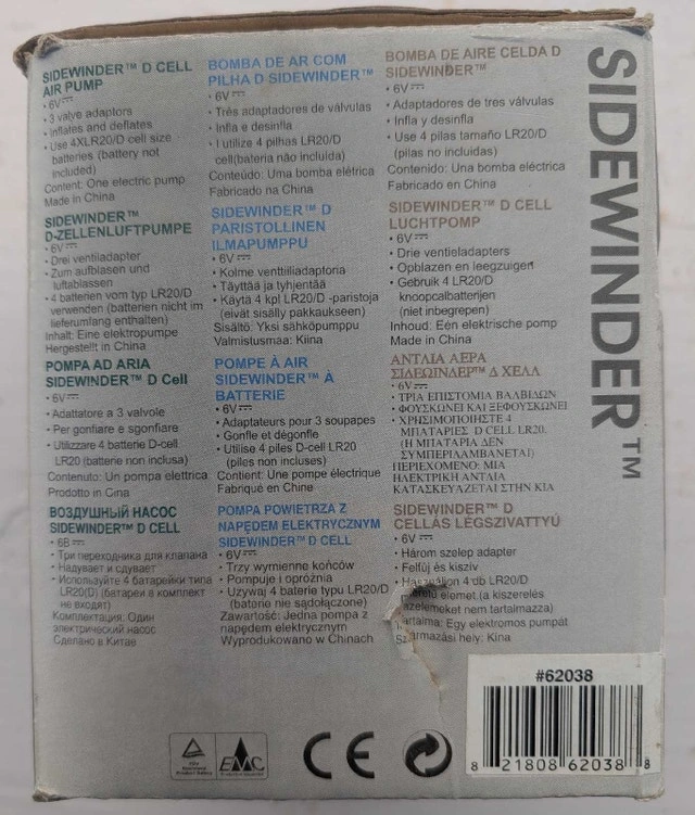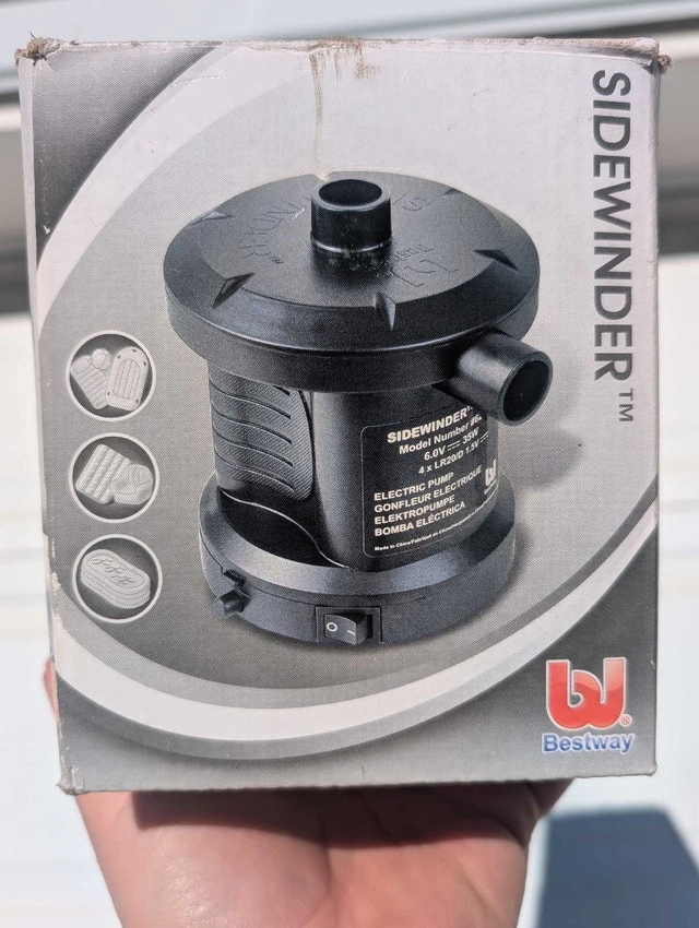 Get ready to inflate with ease using this Bestway Sidewinder electric air pump! It is in NEW condition and ready to help you inflate your inflatables quickly and efficiently. SIDEWINDER™ D CELL battery AIR PUMP with 3 valve adaptors. It inflates and deflates. Uses 4XLR20/D cell size batteries (battery not included). Its compact design makes it easy to store and transport, perfect for on-the-go inflation needs. If the ad is still up, yes, it's still available! So go ahead and give this pump a new home and let it blow up all your pool and Beach toys.