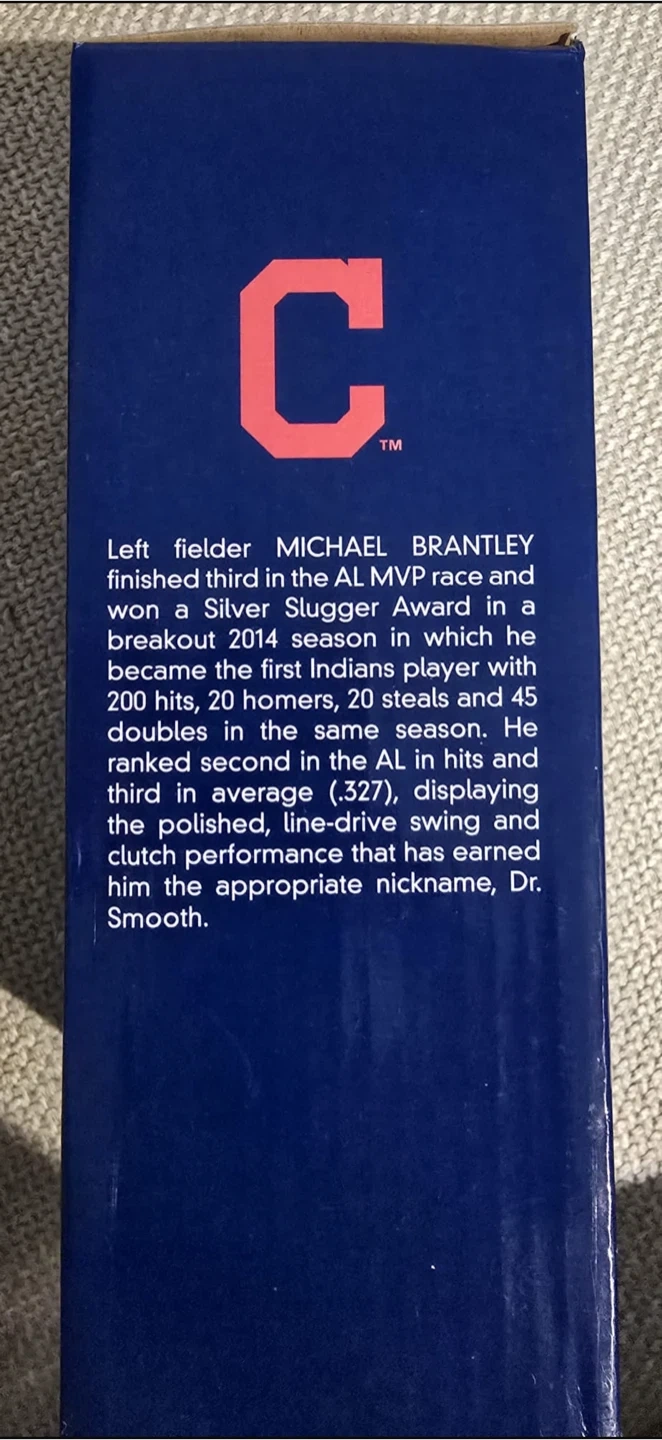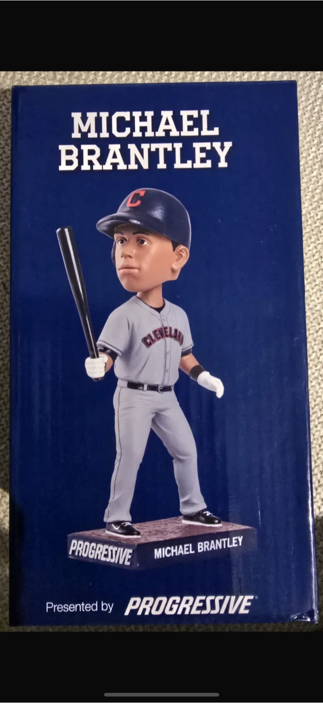Selling a Michael Brantley bobblehead, presented by Progressive. It commemorates his time as a left fielder for the Cleveland Indians. He finished third in the AL MVP race and won a Silver Slugger Award in 2014! Never Open