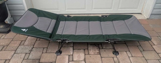 This cot is designed for the outdoors and is perfect for camping or lounging by the lake. It features a sturdy frame, comfortable padding, and folds for easy storage and transport. This cot has been used on a few camping trips but is still in great shape, ready for new adventures.