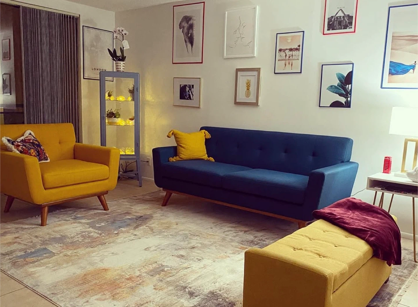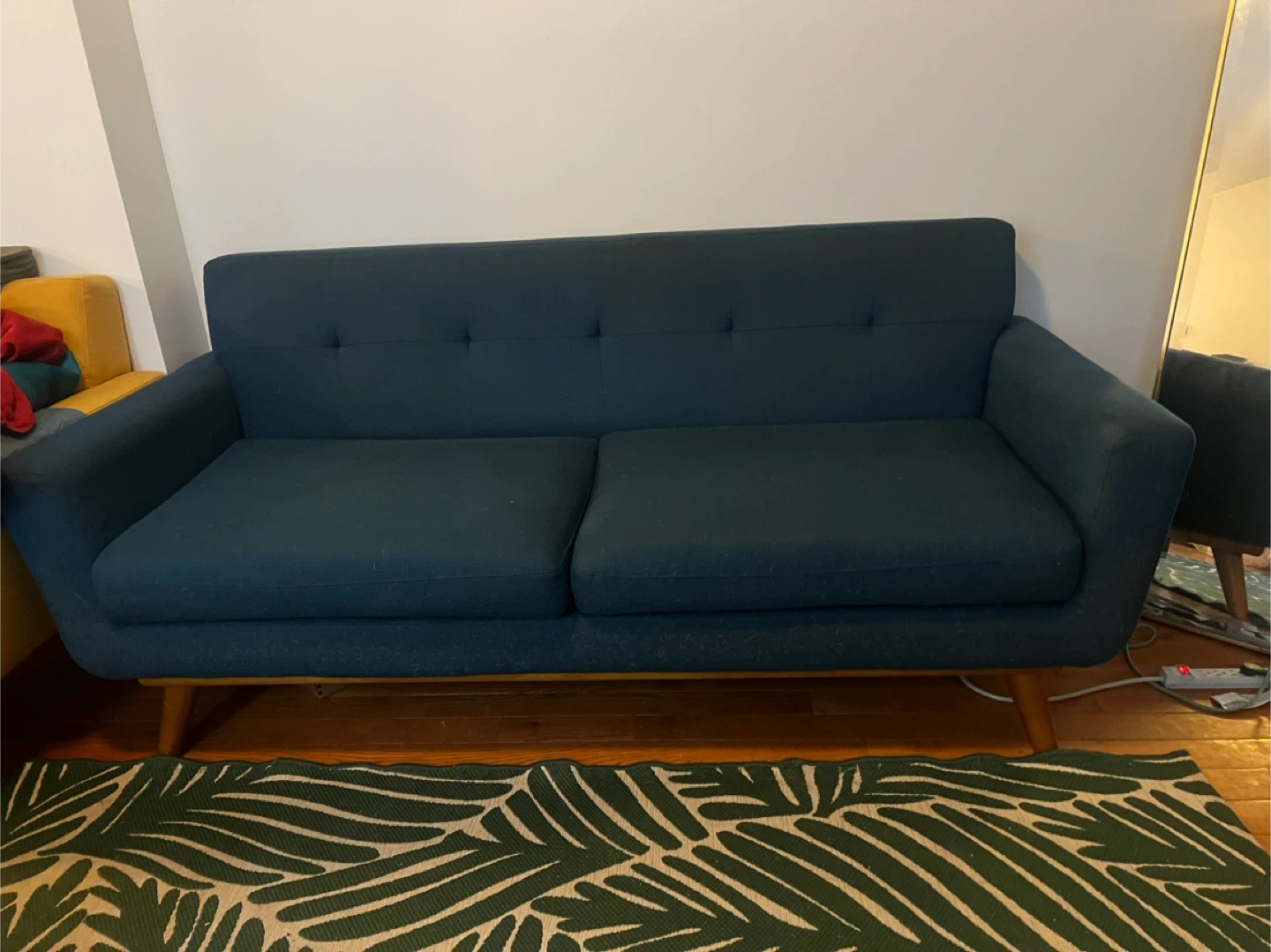 Selling a modern navy blue sofa in great condition! It's a stylish piece that would look great in any living room. The sofa features a sleek design with button detailing on the back cushions. It's comfortable and perfect for lounging or entertaining guests. If you're interested, feel free to reach out!