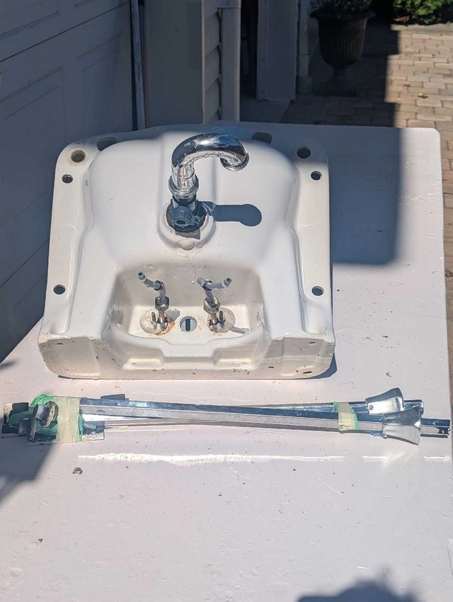 Antique wall mount sink with stainless steel legs. Call or text 705-440-9959. Make an offer!