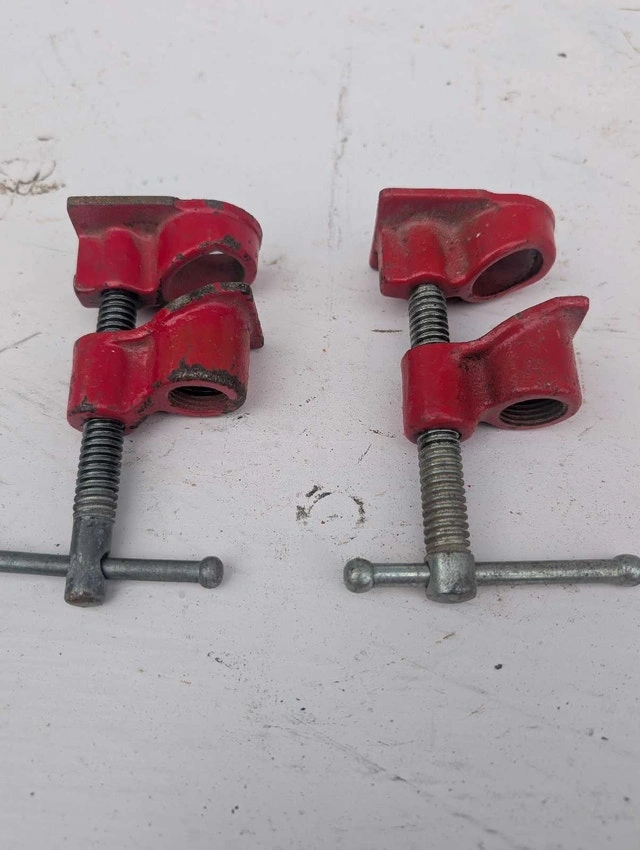 I am selling a pair of used red pipe clamps. These clamps are functional for various woodworking and metalworking projects. Perfect for holding materials securely while gluing or welding. Let me know if you're interested!