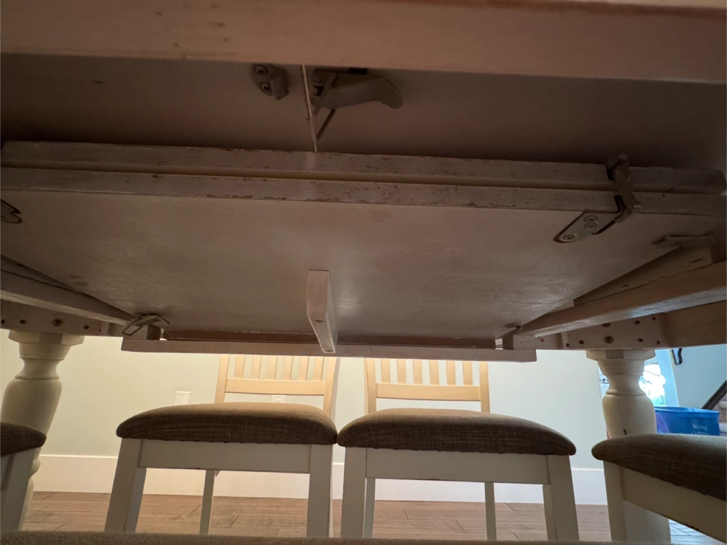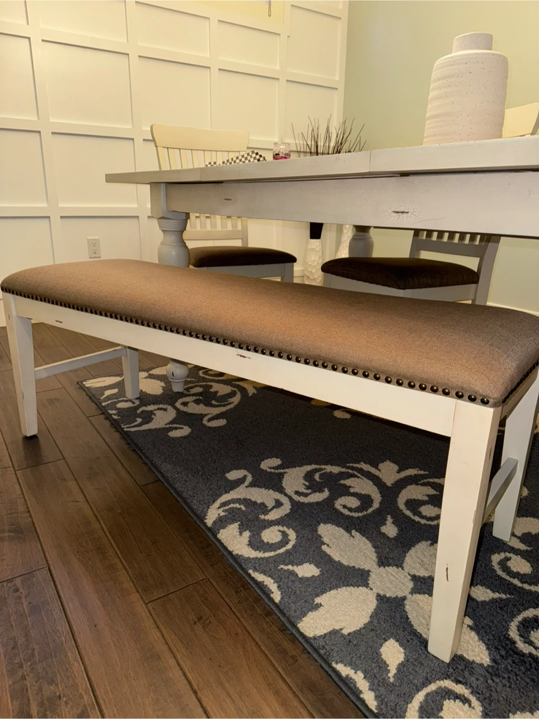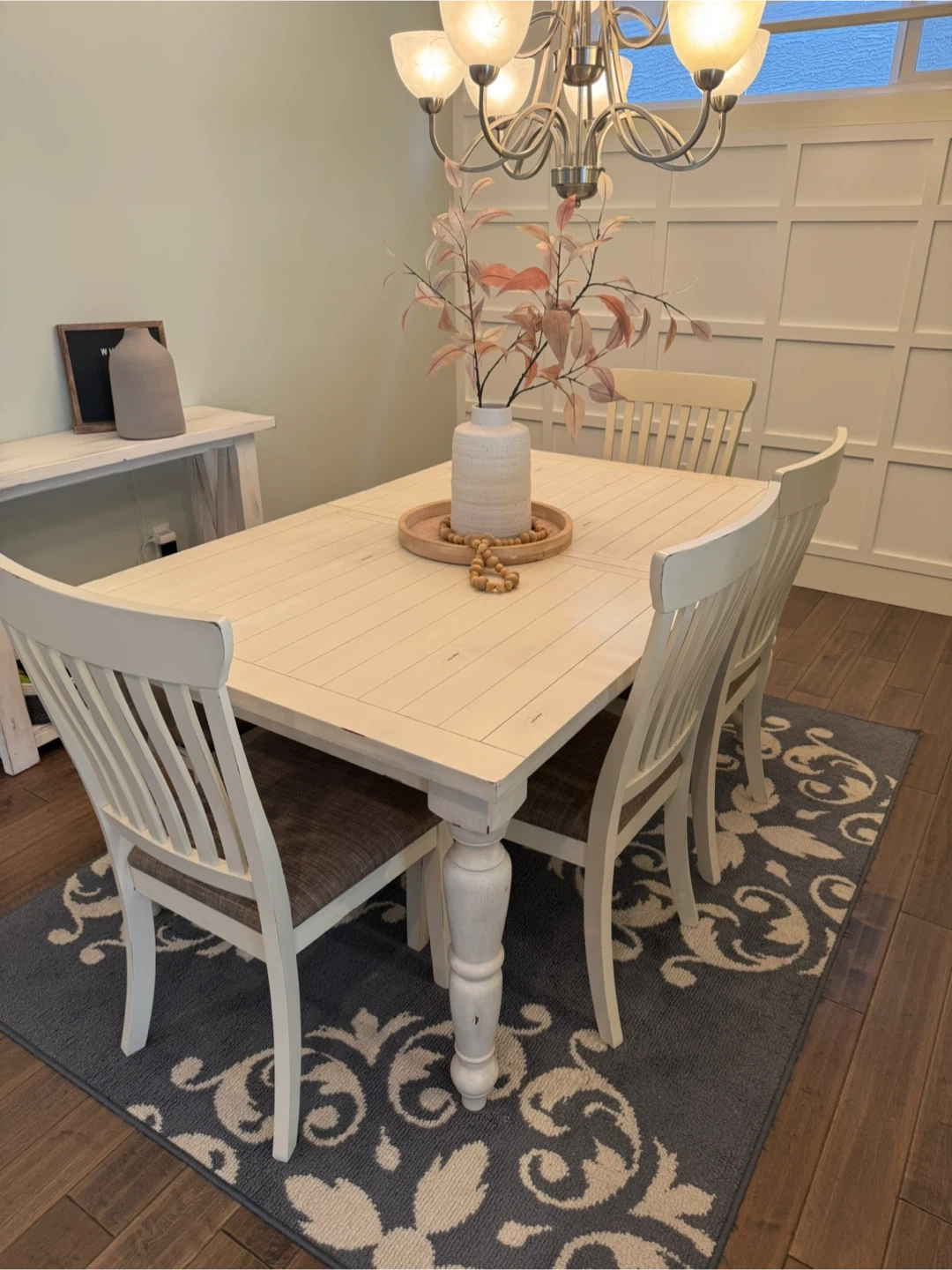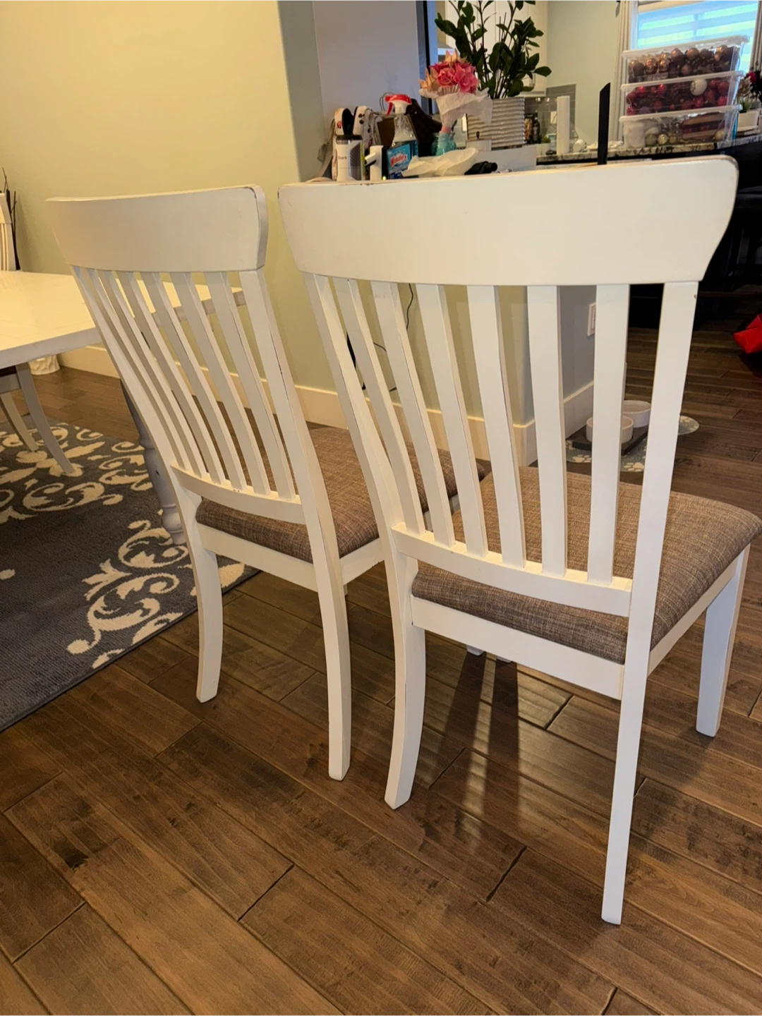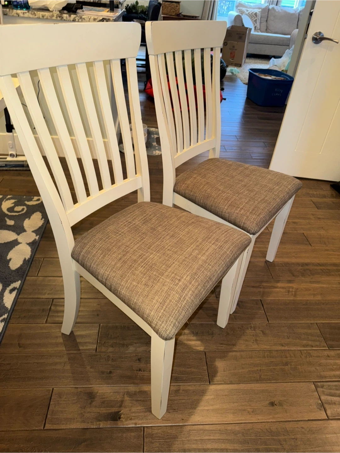 Purchased from Ashley Furniture for $2k+ three years ago. Selling because set does not fit in new space. Table is white (light shows a more cream but it is in fact white) and chairs are taupe/light brown.