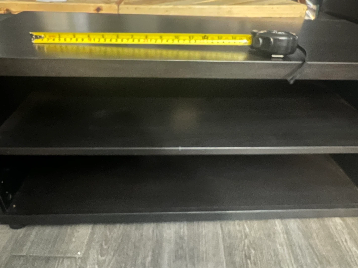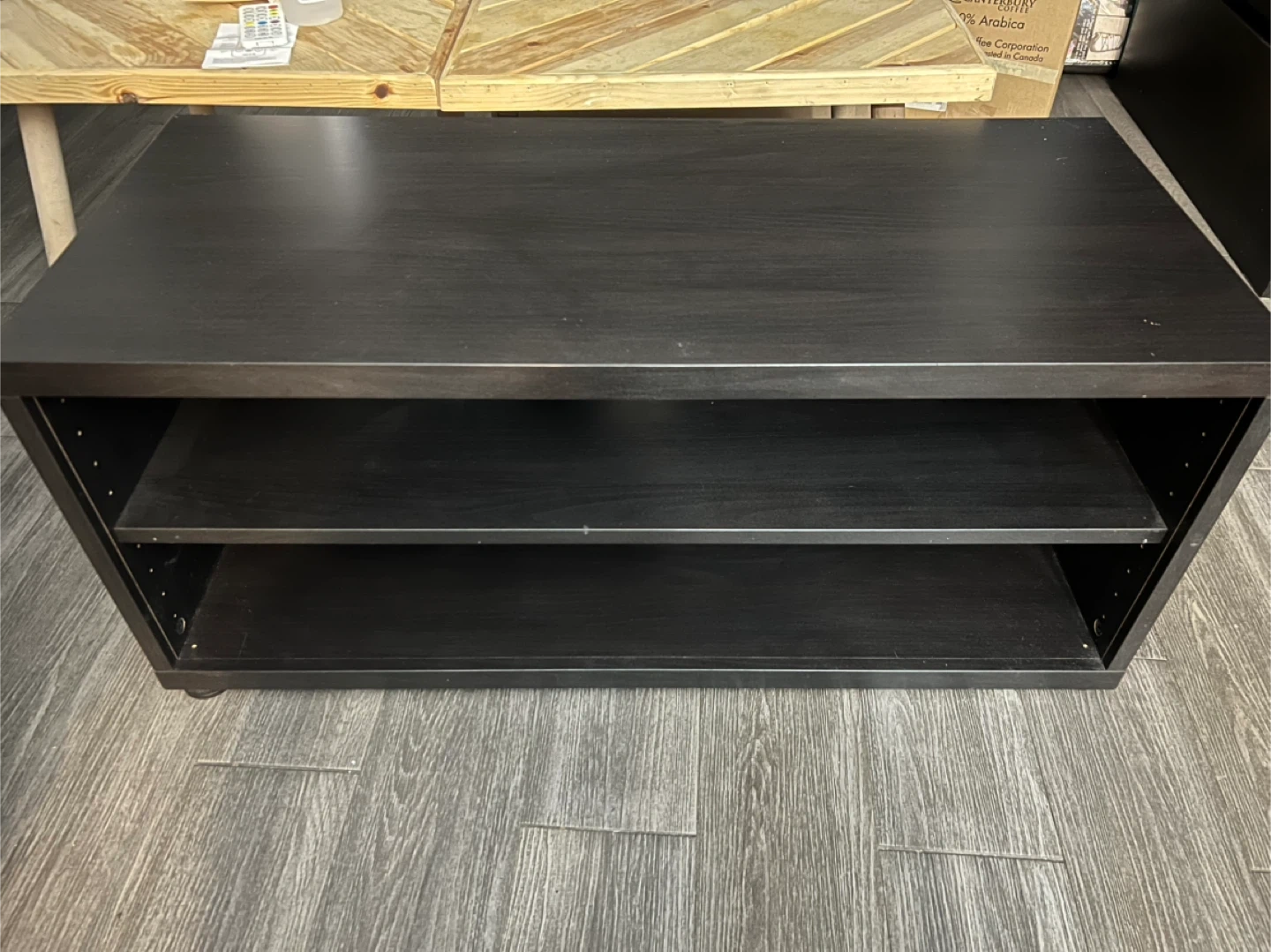 Selling a black TV stand. It has a simple and functional design with two shelves, perfect for storing media devices or displaying decor. It's in great condition and ready for a new home!