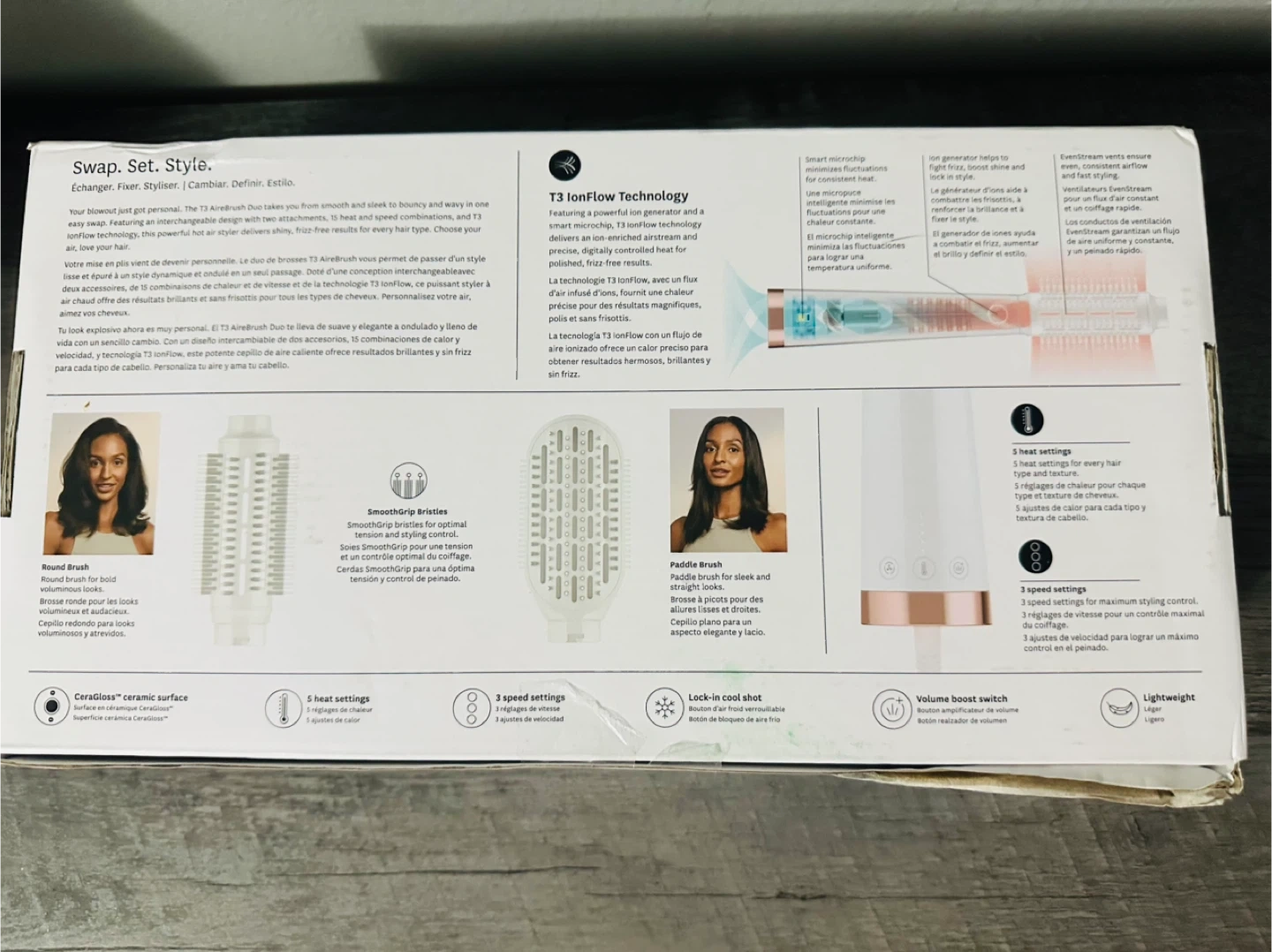 I am selling a T3 AireBrush Duo, which is an interchangeable hot air blow dry brush! It comes with two attachments and includes 15 heat and speed combinations. The T3 IonFlow Technology helps dry hair quickly and efficiently. It also has a volume booster switch and a lock-in cool shot. The original price was $249.99