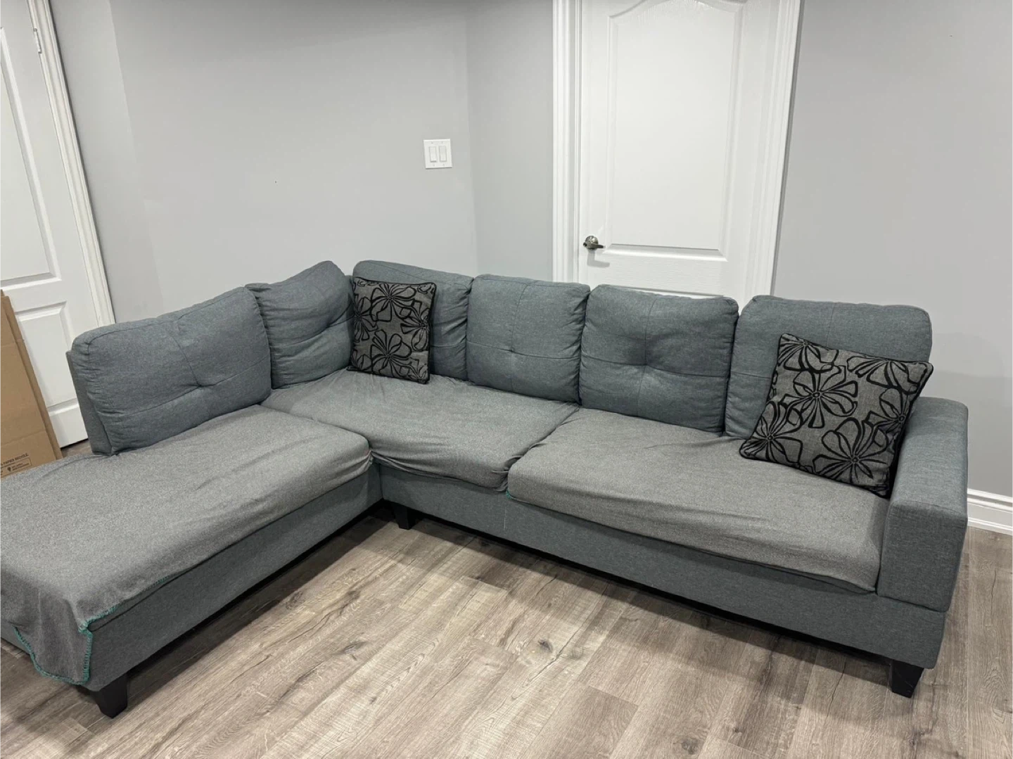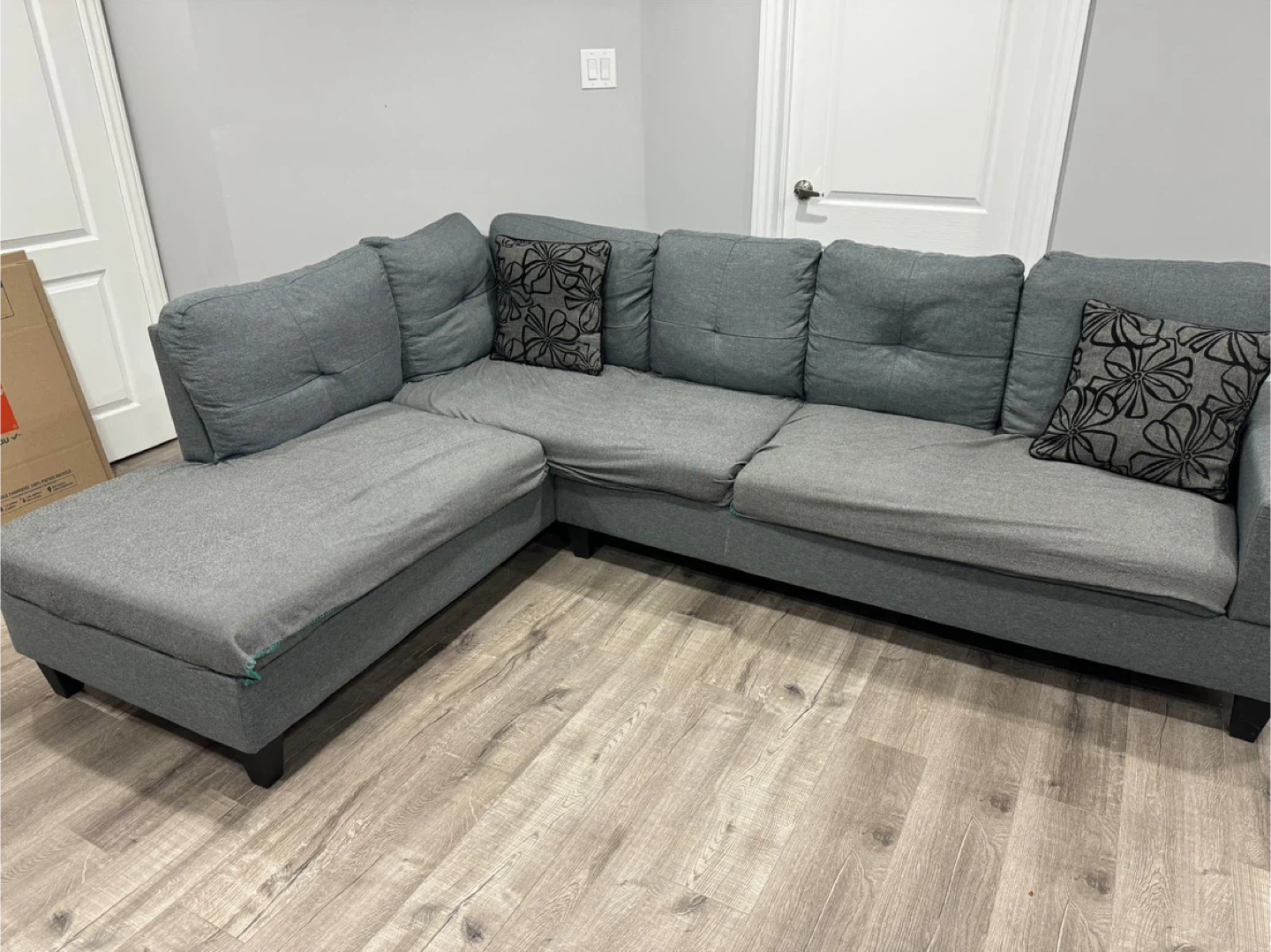 Selling a comfortable grey sectional sofa! It's in good condition and perfect for a living room or basement. The sofa comes with decorative pillows as shown in the pictures.
