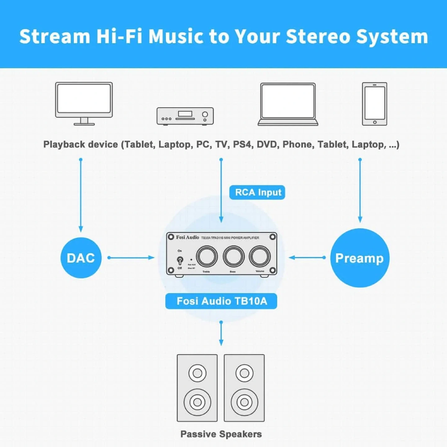 Looking to stream Hi-Fi music to your stereo system? I'm selling a Fosi Audio TB10A TPA3116 mini power amplifier. It's a mini compact but powerful desktop amp for driving passive speakers. Included in the box are the amplifier, AC cord, power cord, and user's manual.