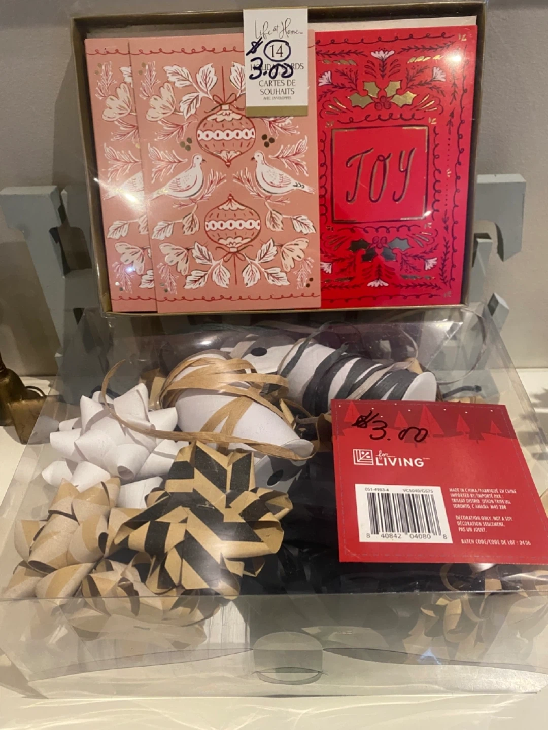 Selling a set of holiday cards and bows from Life at Home. The set includes 14 cards with envelopes and a variety of decorative bows. Great for adding a festive touch to your gifts and greetings!