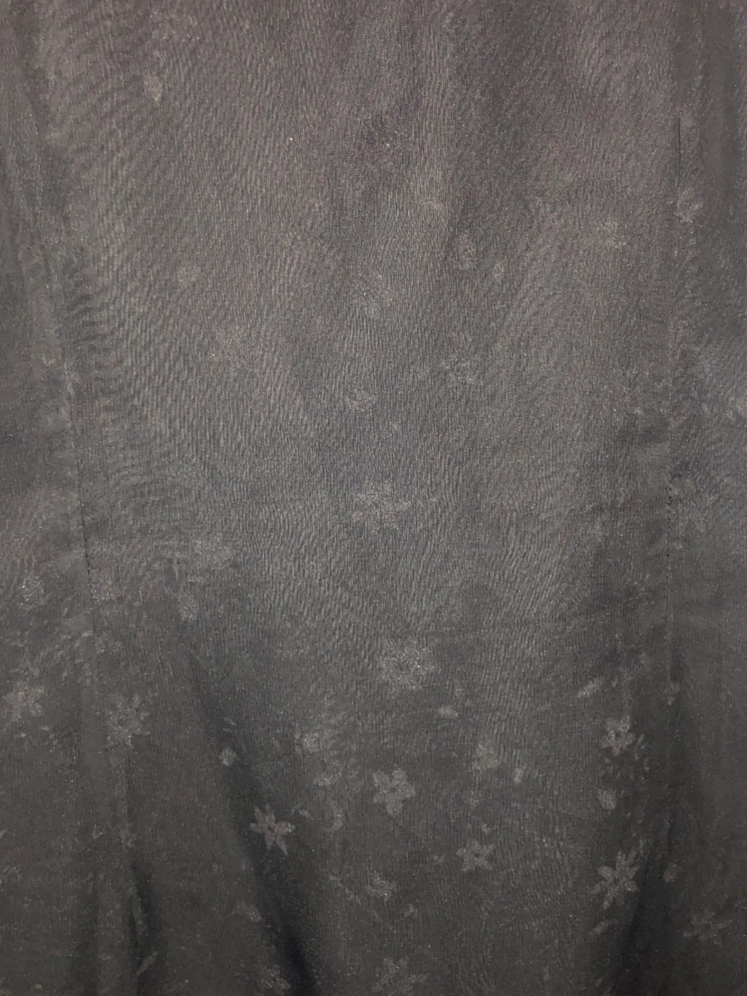 This is a classic little black dress, perfect for an evening out or special occasion. This dress is in good condition, showcasing a timeless design and flattering silhouette. There are no visible signs of wear and tear. This dress has a beautiful floral pattern woven in.