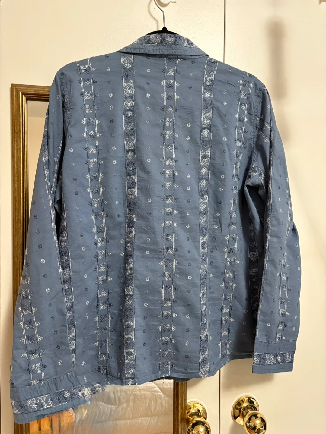 This is a gently used Cotton Ginny brand shirt, perfect for casual wear! It features a button-down style with a unique pattern. There is some wear, indicating it is not new but still in good condition.