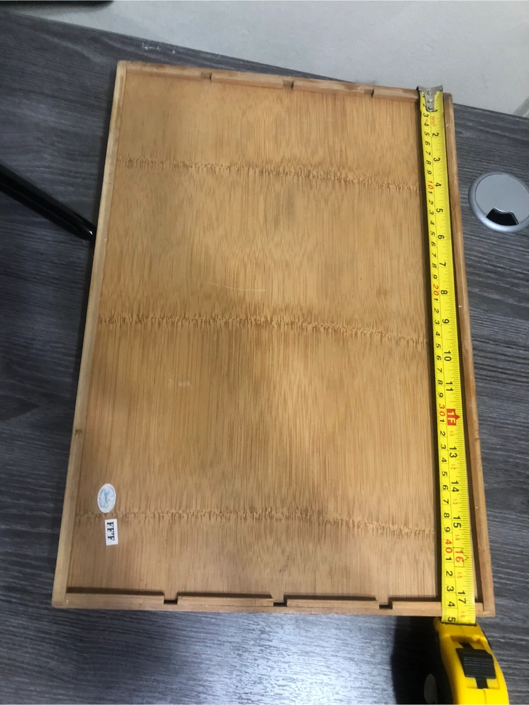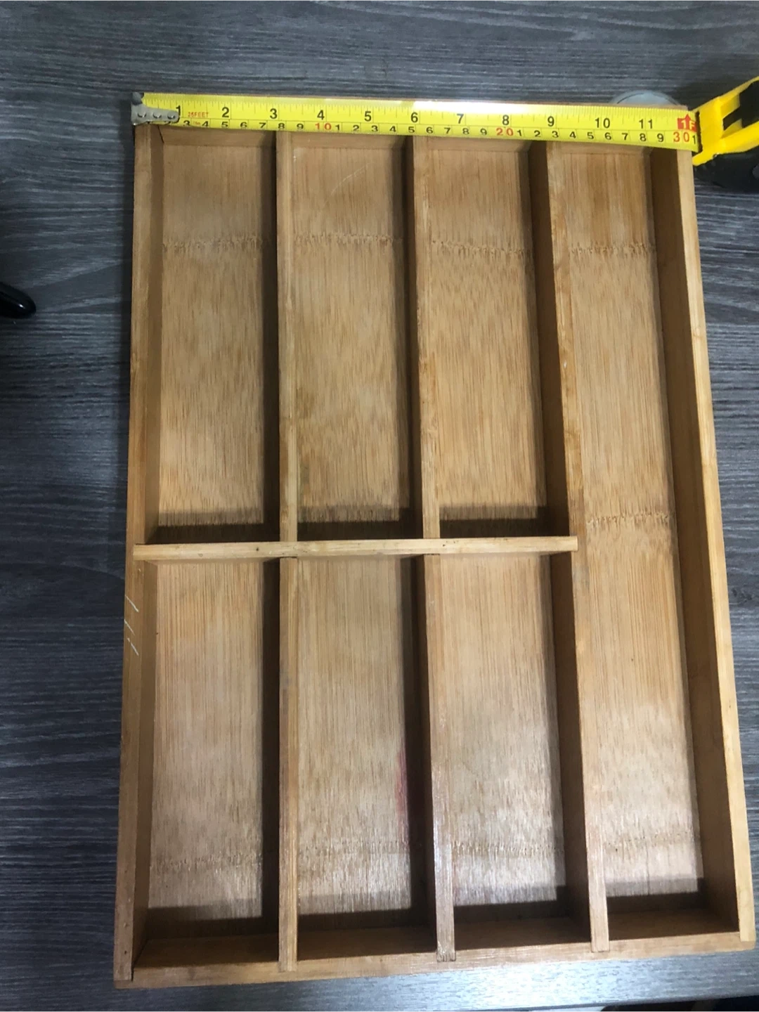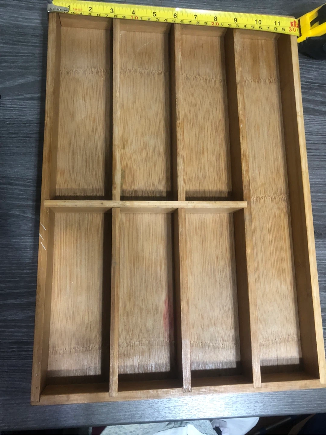 Here's a handy bamboo drawer organizer! It's in great shape and ready to help you tidy up your space. It measures approximately 11 inches by 15 inches.