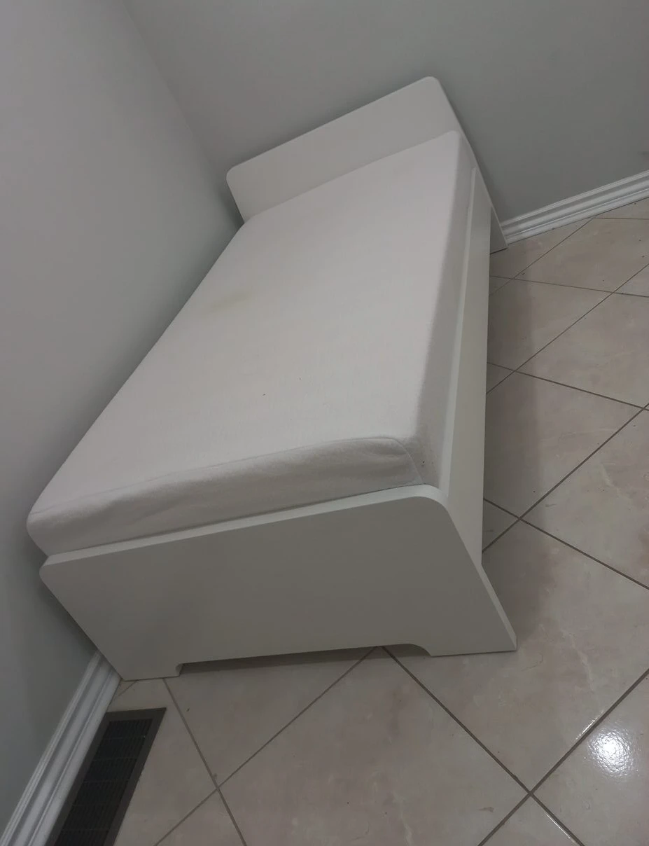 Selling a toddler bed in white. It's in good condition and perfect for transitioning your little one from a crib to a bigger bed. It has a low profile, making it easy for kids to climb in and out. There is a small stain on the mattress.