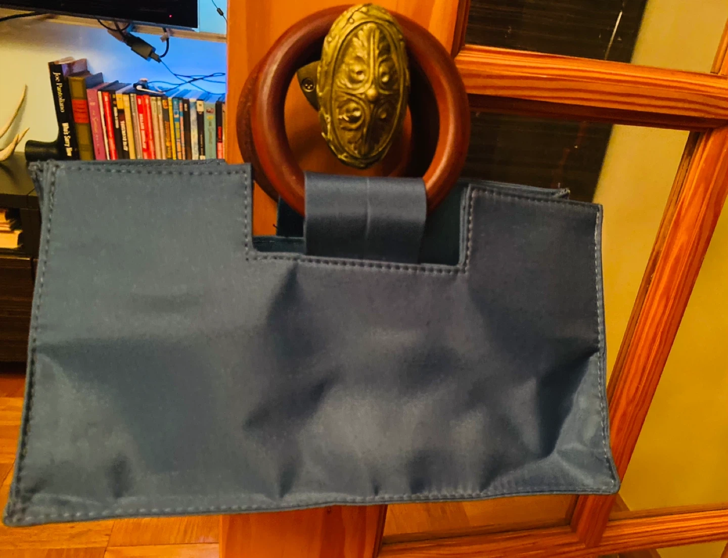 This is a stylish blue tote bag featuring unique wooden handles. It's a great accessory to complete your look. The bag is in good condition and ready to go!