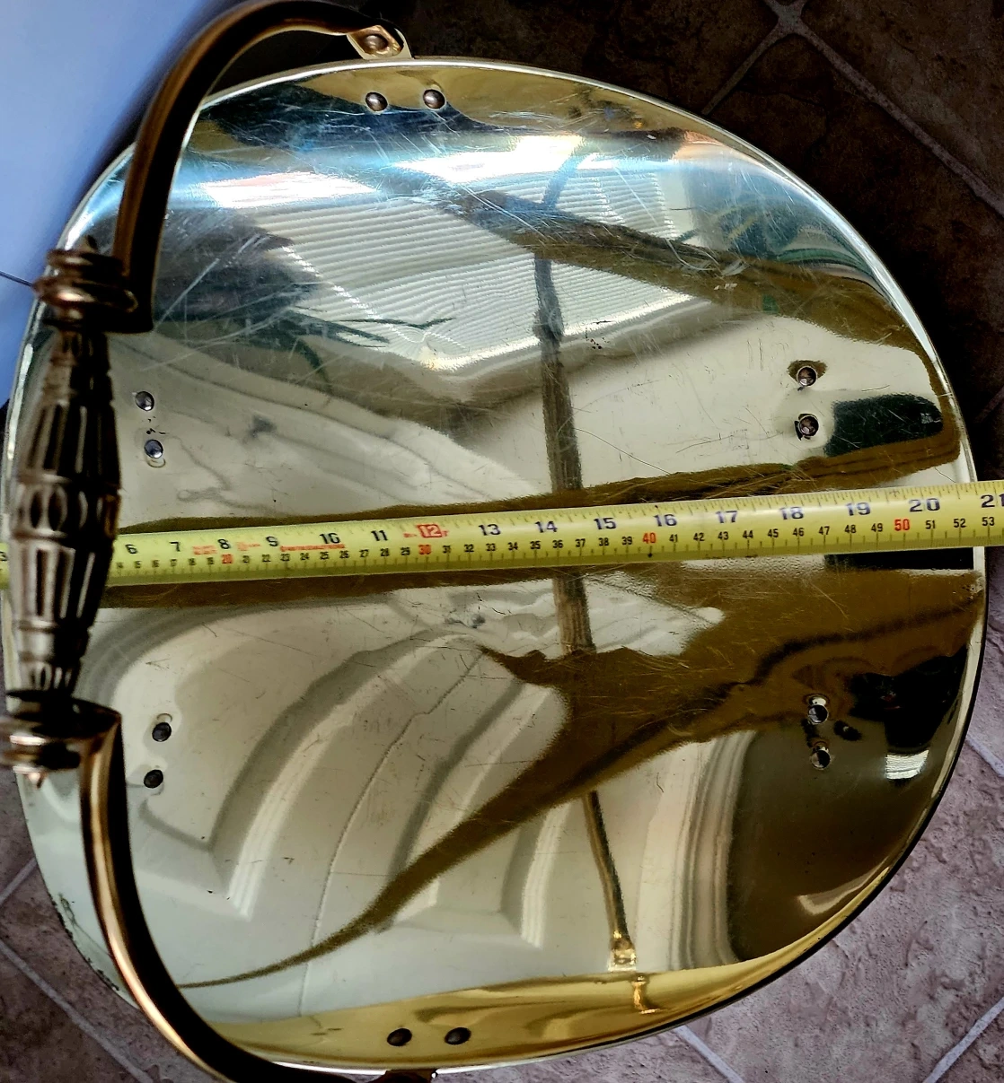 Here's a vintage brass firewood log holder! It measures approximately 20 inches in length. It's a beautiful piece that will add a touch of elegance to your fireplace area