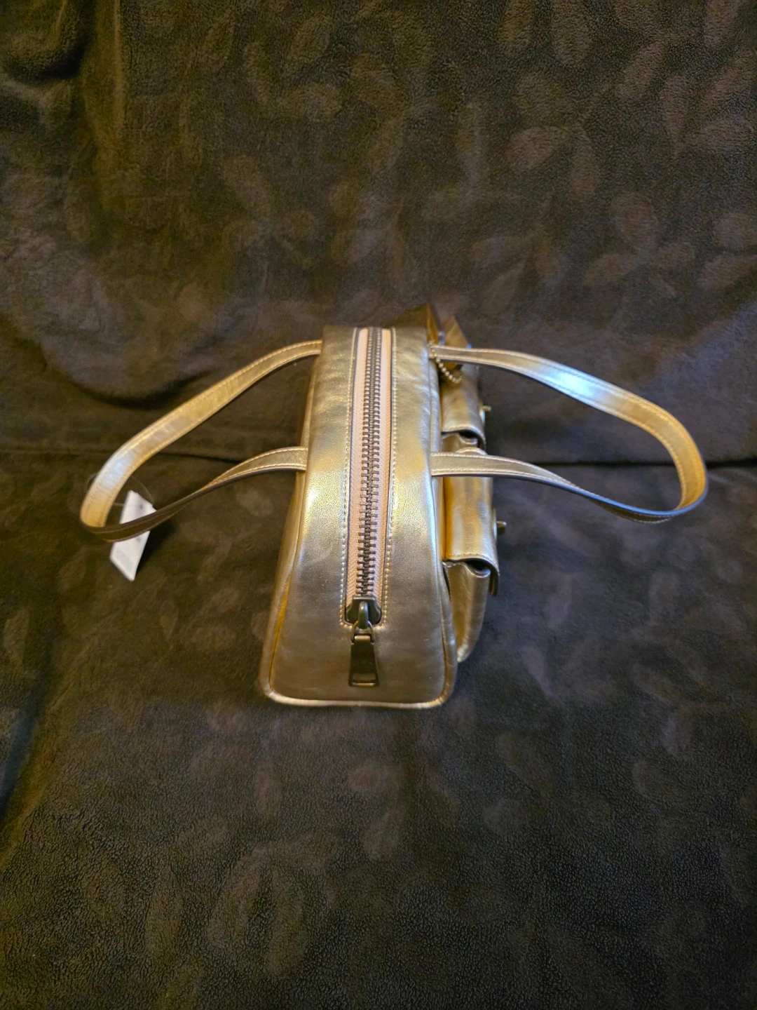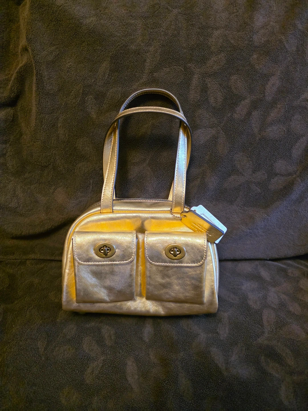 Crafted of metallic leather and a brilliant sheen, it's finished with two front patch pockets detailed with Coach's iconic turnlock closure.