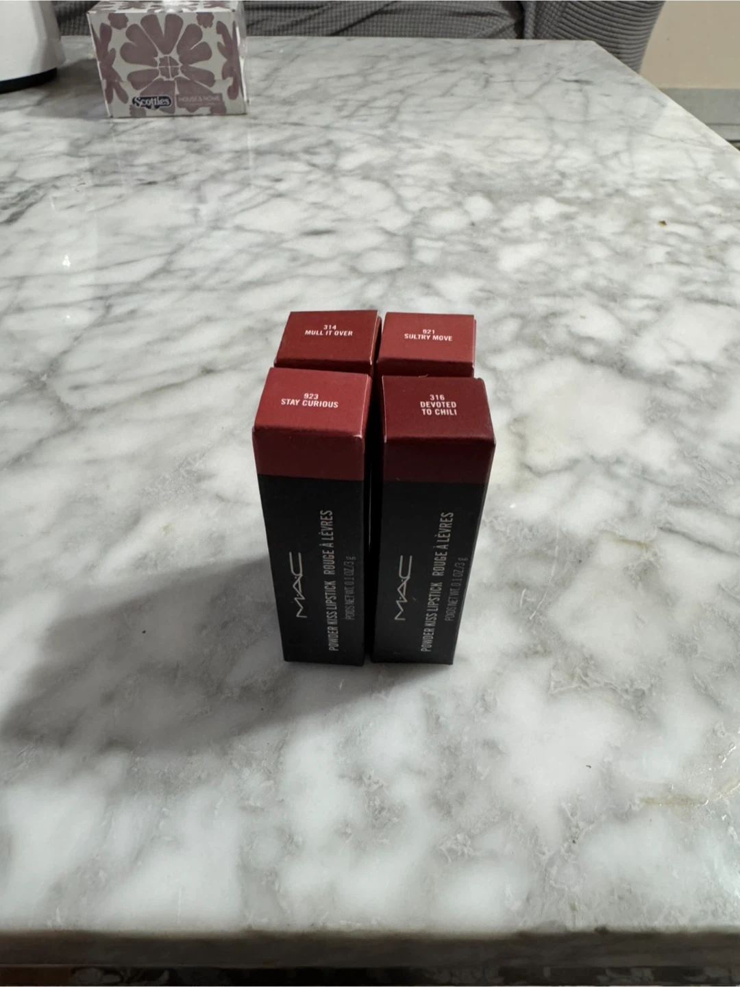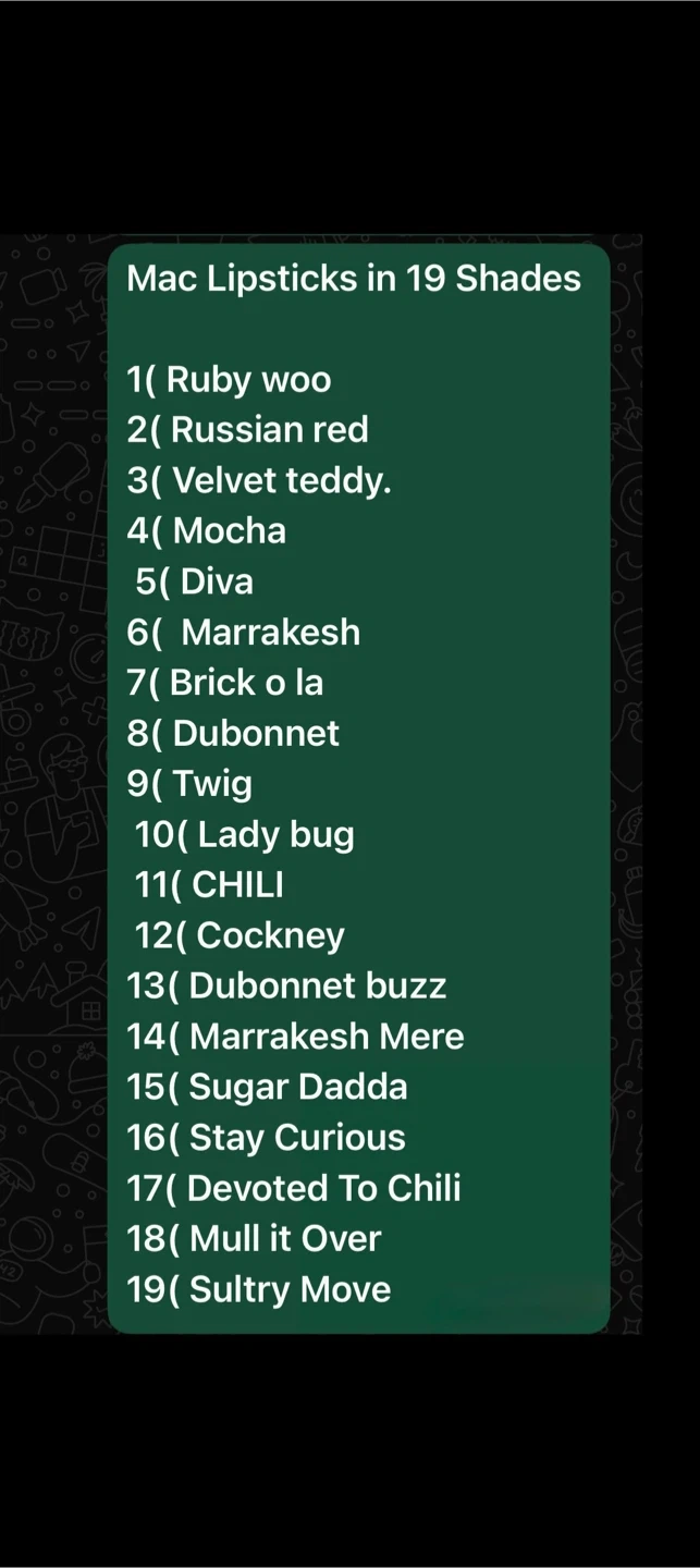 Selling a collection of MAC lipsticks in various shades. The shades include Ruby Woo, Russian Red, Velvet Teddy, Mocha, Diva, Marrakesh, Brick O La, Dubonnet, Twig, Lady Bug, Chili, Cockney, Dubonnet Buzz, Marrakesh Mere, Sugar Dadda, Stay Curious, Devoted To Chili, Mull It Over, and Sultry Move they are on Sale Now each $7