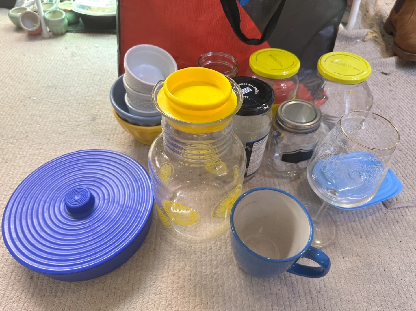 Includes a variety of items like bowls, jars, mug, glass, storage containers, etc. Please take everything and pass on what you don't need.