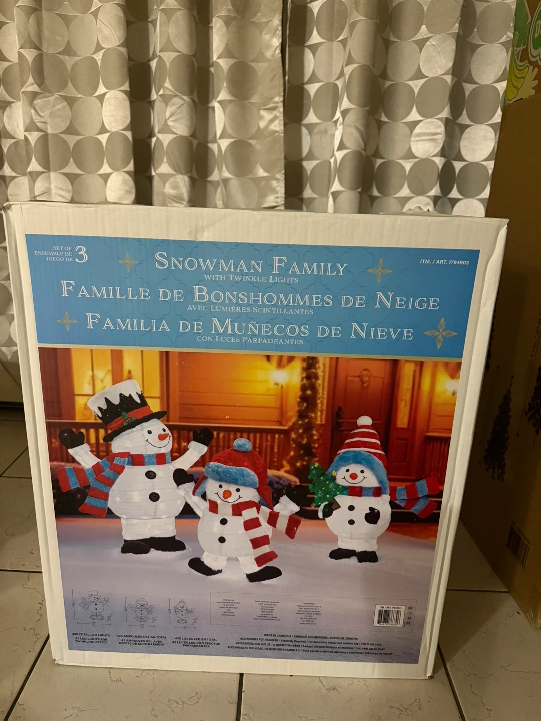 Selling a set of 3 Snowman Family decorations with twinkle lights! The item number is 1784903. The gross weight is 14.80 kg and the net weight is 12.00 kg. Comes in the original box