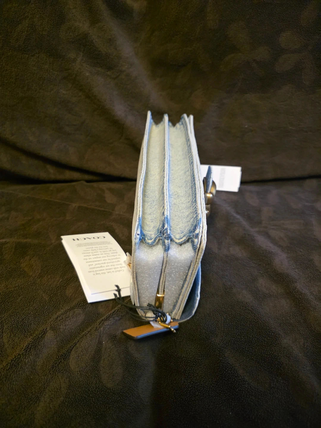 Crafted of vachetta leather and light-wash denim accented with vintage-inspired crystals.