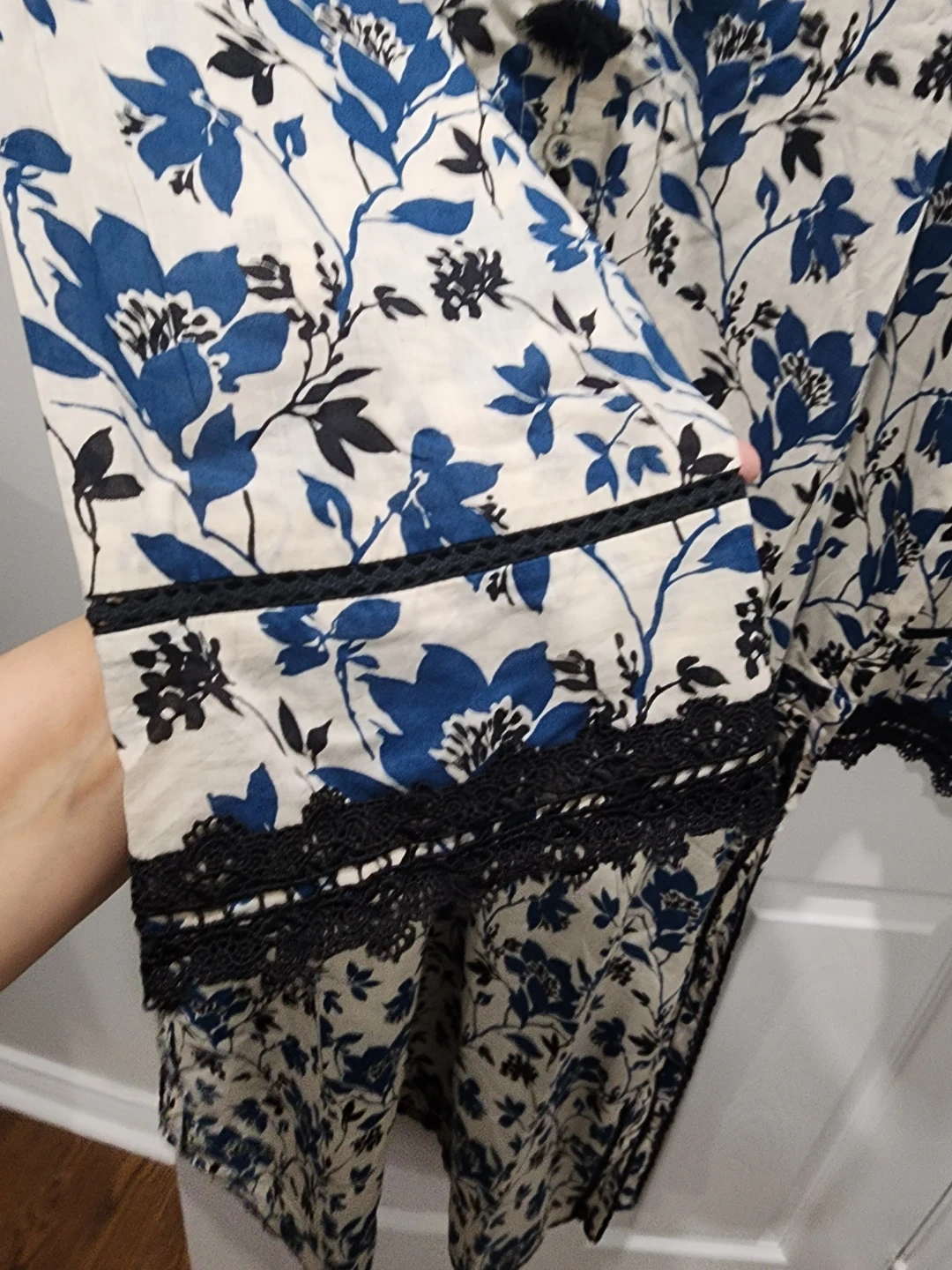 Selling a beautiful floral print kurti with matching pants! The kurti features a lovely blue and black floral pattern on a white base, accented with delicate black lace detailing. It has a button-down front with cute tassel embellishments. The pants complement the kurti perfectly with a coordinating blue pattern. Perfect for a stylish and comfortable outfit!